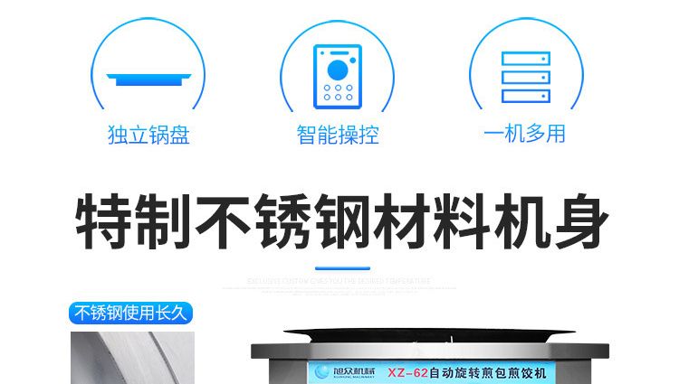 JGB-62自动旋转煎包煎饺机能够有效的防止饺子/包子烧焦,使每个饺子/包子受热均匀等功能;外壳均由不锈钢制造,外观精美耐用,机器使用燃气。
