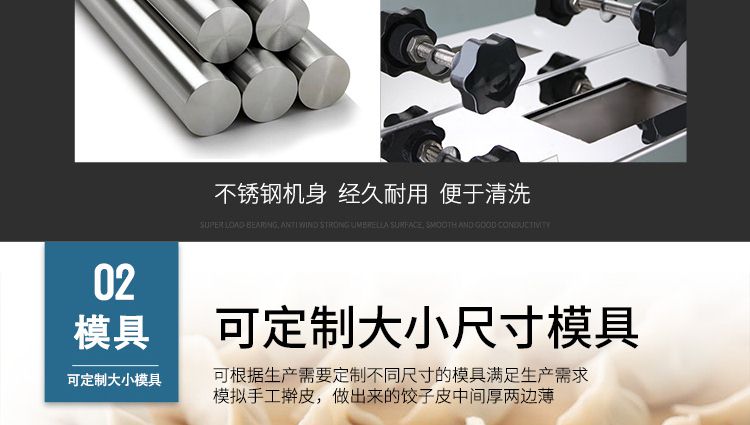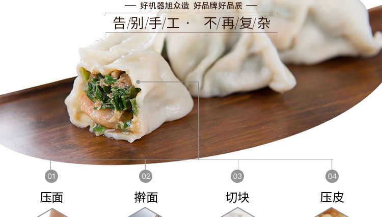 本机具有高效节能、安全卫生、无边角废料、大小厚薄可定制等优点,使所生产饺子皮在外观、口感、重量达到空间统一,从而转变了当今生产效率低、员工挥霍、二次污染、中部缺口等现状,该仿手工饺子皮机除具有以上优点外,还可依据生产必要转变出皮速度等优点。