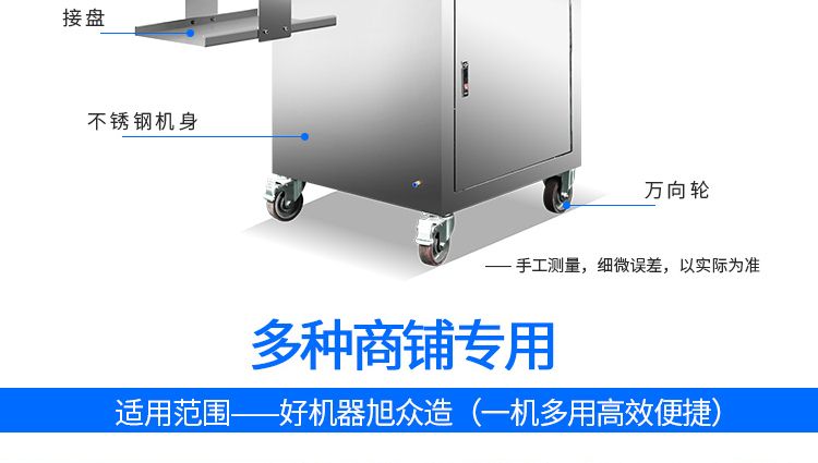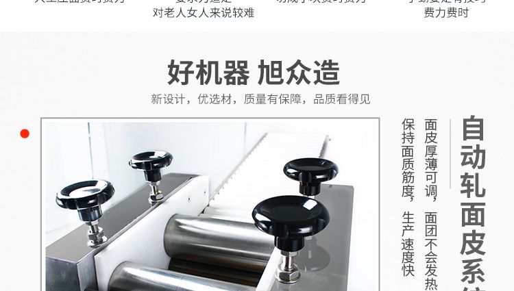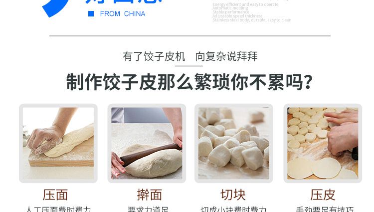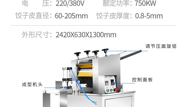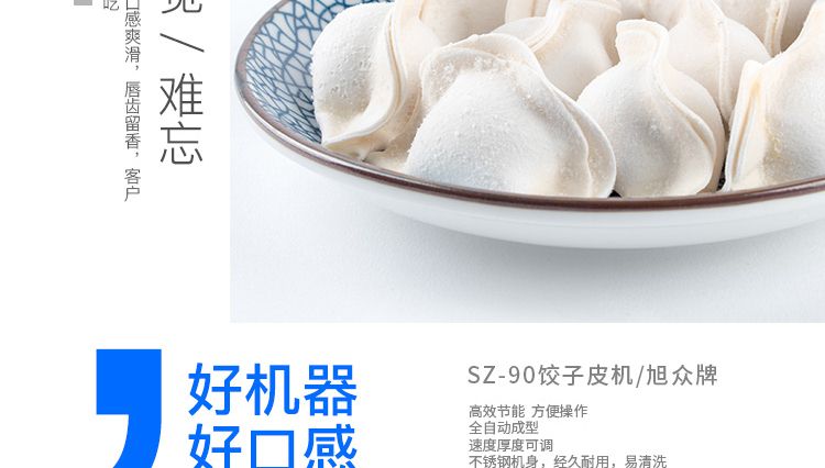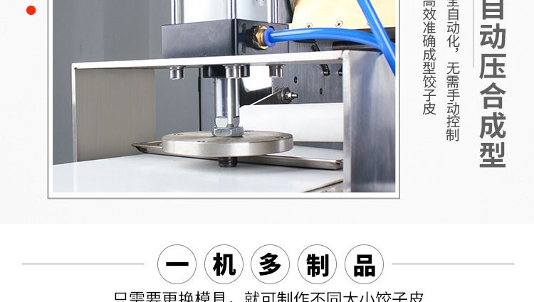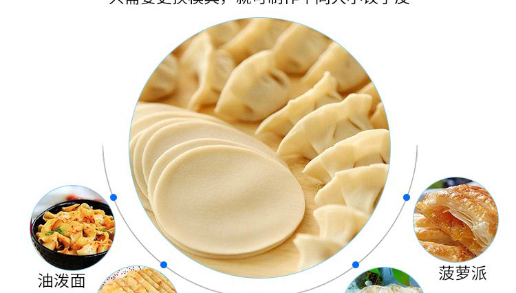 JGB-90型饺子皮机是我公司开发生产的先进饺子皮生产设备。可以简单更换模具(可根据客户定制不同形状、尺寸的模具),本设备采用气缸运动。本厂生产的90饺子皮机,采用多道压面辊压面,压面效果优异,压出的面皮筋道,进一步提高所包出的饺子口感。
