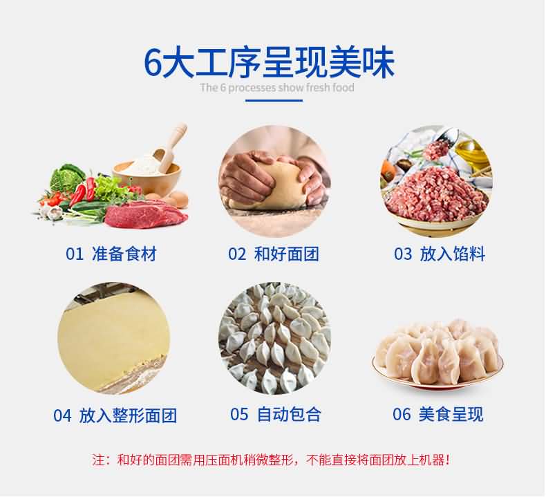 ◆采用多道压面辊压面,压面效果优异,压出的面皮筋道,进一步提高所包出的饺子口感。