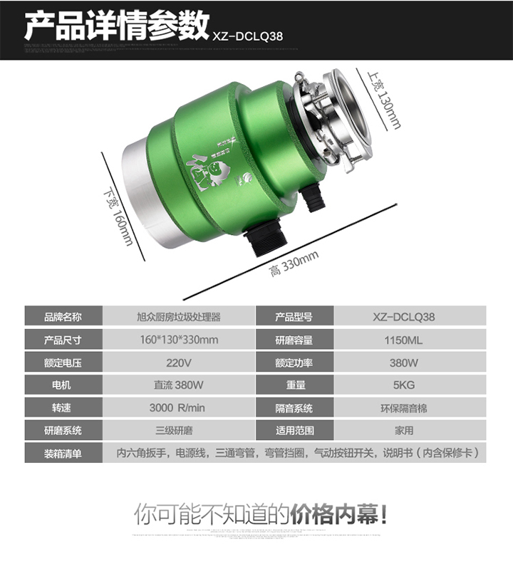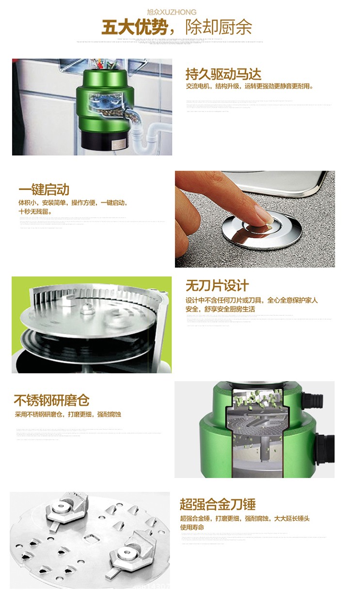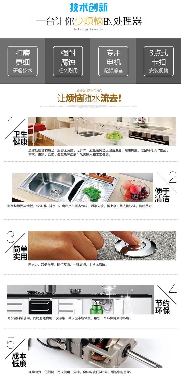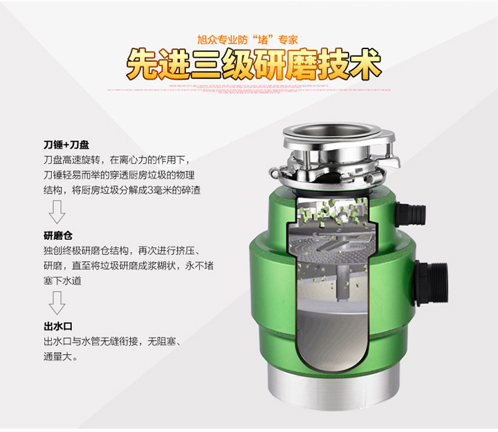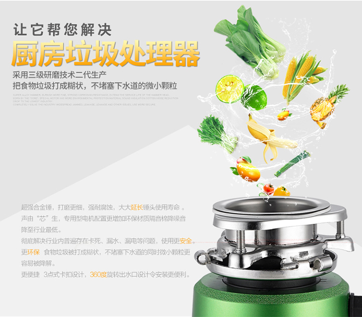 DCLQ38-厨房垃圾处理器,该机拥有独特的粉碎功能,使所有垃圾研磨吸毒真正低于3毫米,用户不用为管道堵塞而烦恼,粉碎后粗、细两种垃圾通过滤孔自动分离,成浆状的细垃圾随水流流入管道,粗的垃圾会稍停留在研磨仓继续粉碎,形成粉末状后,再随水流流入管道,客户可以放心使用。
