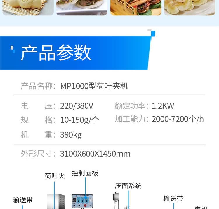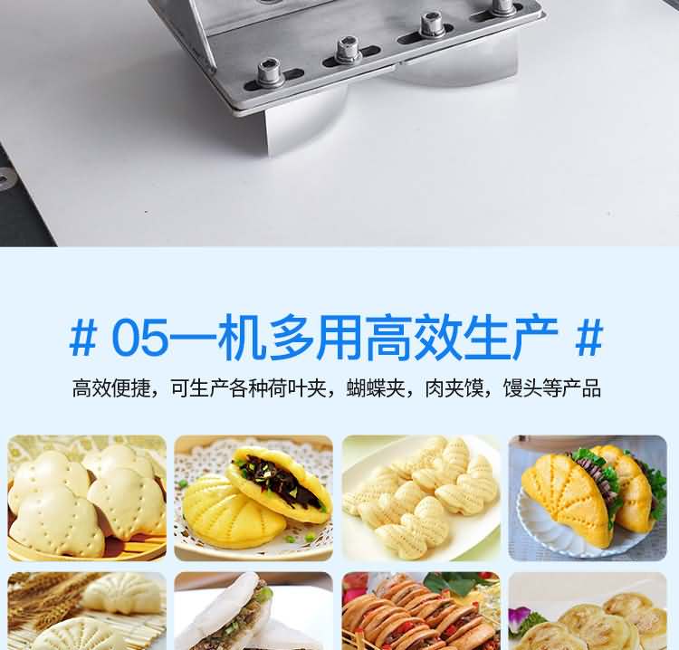 MP1000荷叶夹机,可生产各种荷叶夹、蝴蝶夹、肉夹馍、也可生产刀切馒头等面食产品。适用于个体户、食品厂、学校等各种工作场所,可满足不同客户群体。免费提供工艺技术。