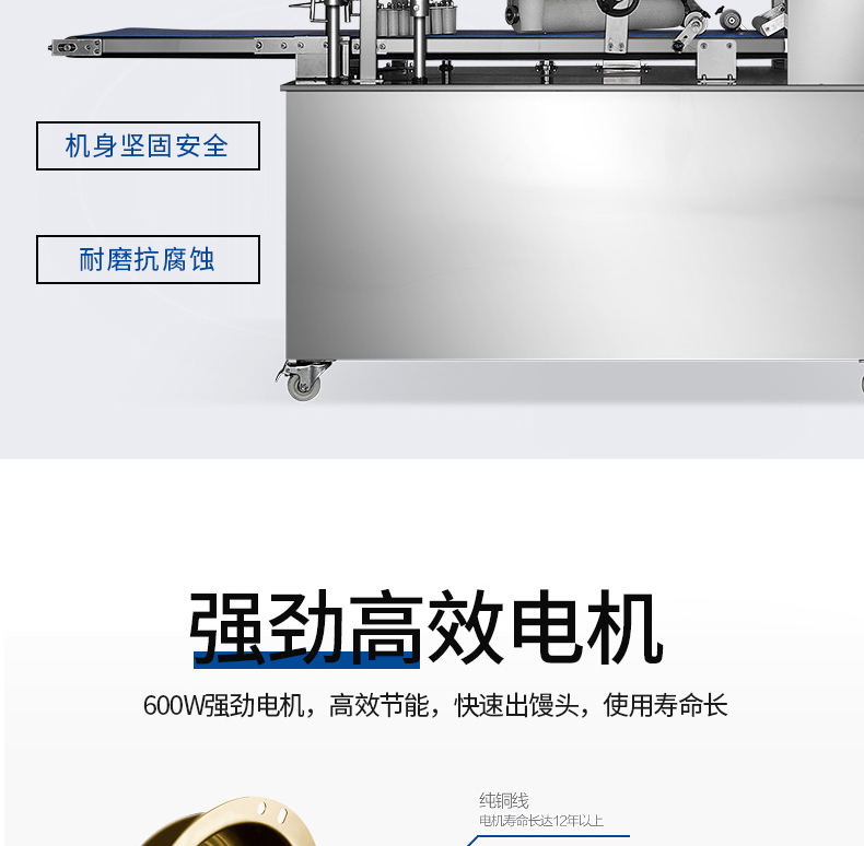 本机对面粉质量要求不高,适用于各种工作场所,工作效率相当于12-18个工人同时手工制作馒头,真正的低投入、高收效、节省资源。