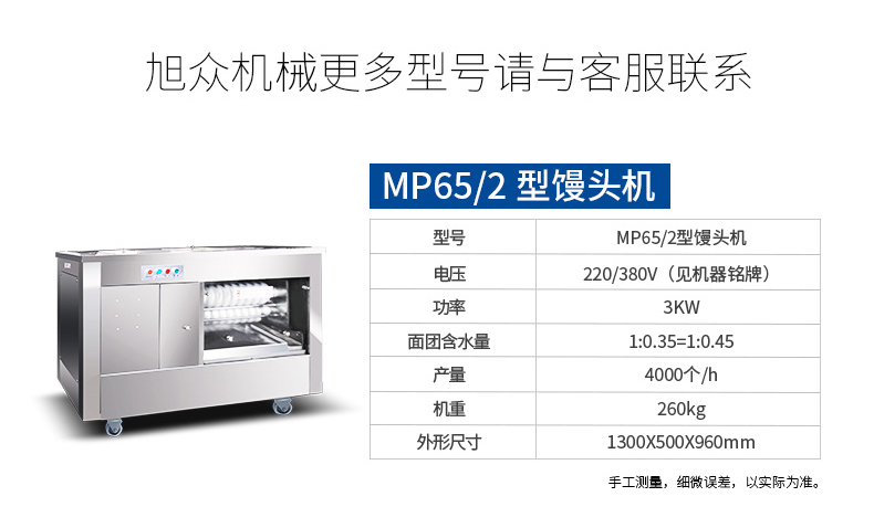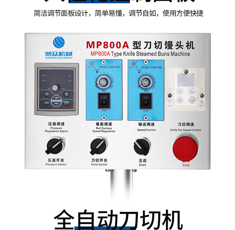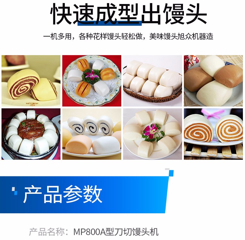 旭众MP800A型刀切馒头机采用高品质微电脑控制,人性化的控制面板,控制准确可靠,操作简单,可生产各种刀切馒头、花卷等面食产品。