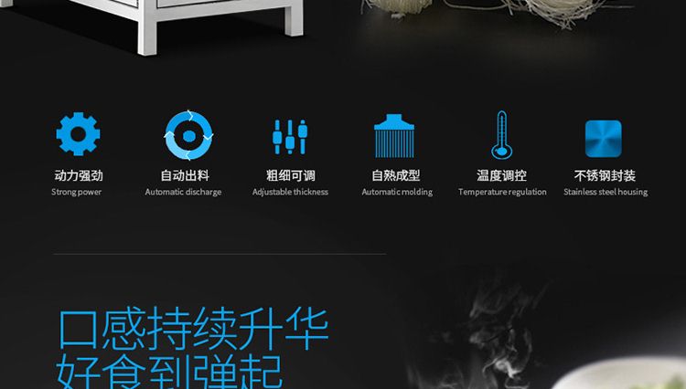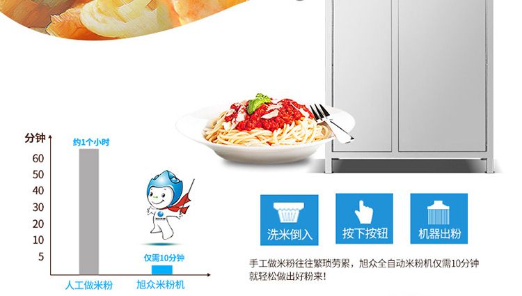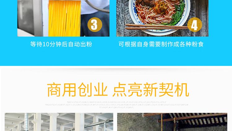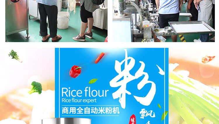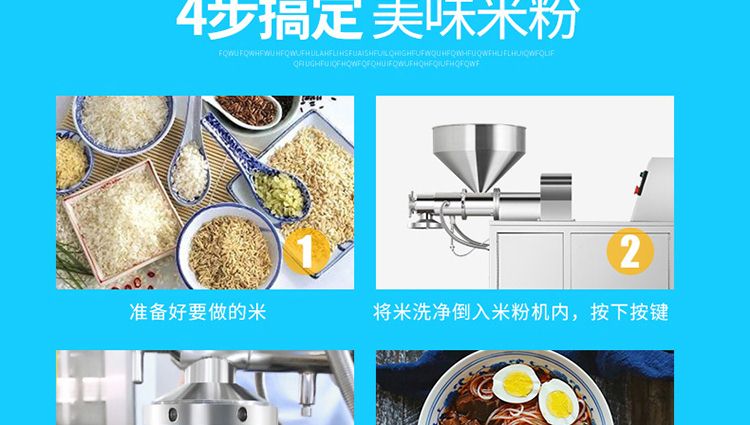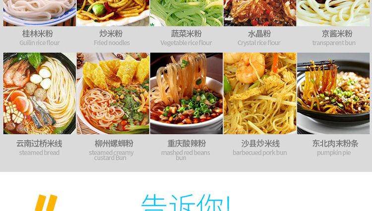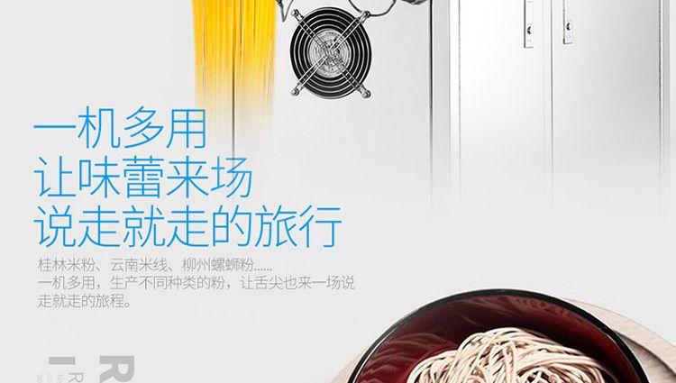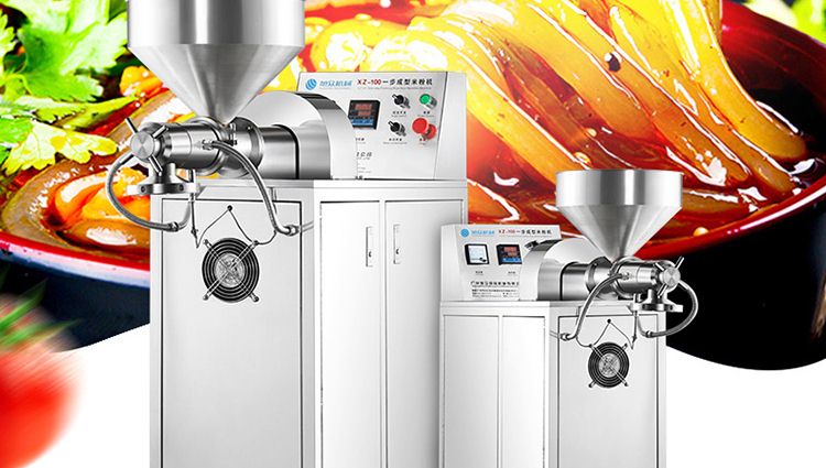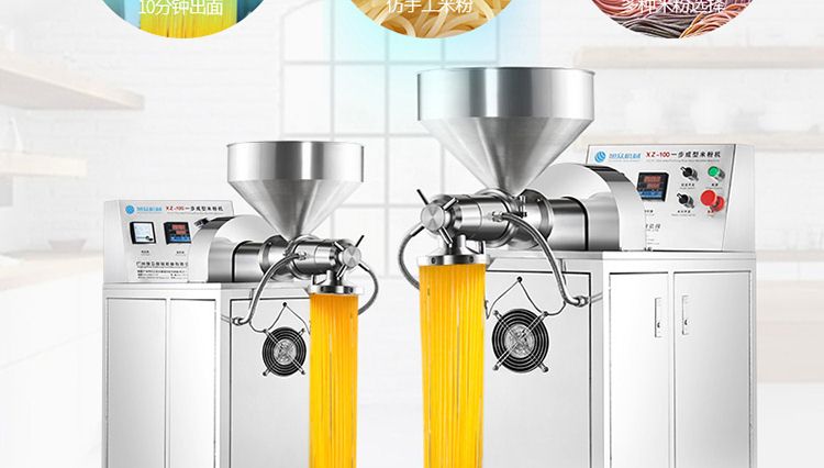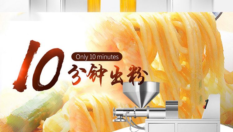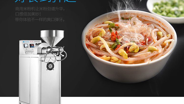 一步成型米粉机,一机多用:米粉机广泛适用于所有含淀粉类粮食作物。大米、玉米、荞麦、红薯、土豆、绿豆、豌豆等都可以生产,它不仅能生产米粉、米粉、朝鲜冷面、牛筋面、年糕、玉米面条、各种杂粮粉丝、各种面条、杂粮面条、彩色面条等多种面食品
