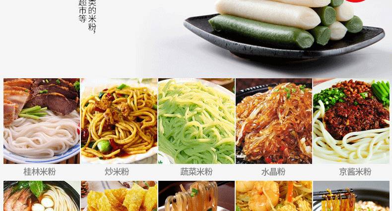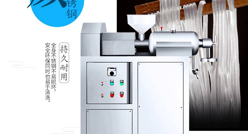 ◆ 不锈钢米粉机生产多样性可生产米粉、米线、粉丝、粉条、年糕、玉米面条、各种杂粮粉丝、各种面条、杂粮面条、彩色面条以及以红薯、玉米、大豆、蚕豆等制成淀粉为原料的等多种食品而且每种食品厚薄、粗细等规格可根据需要任意调整。