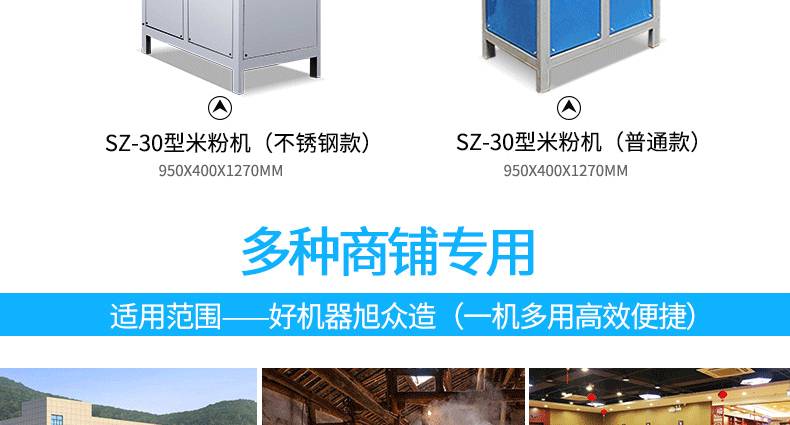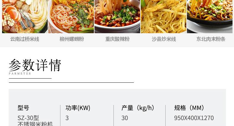 SZ-30不锈钢米粉机,可生产米粉、米线、桂林米粉、过桥米线、年糕、糍粑等产品。各种形状都可生产(圆、扁),加工食品外表光滑,厚薄、宽窄、粗细均匀可调,筋软适度,有弹性,口感柔软、味道纯正。