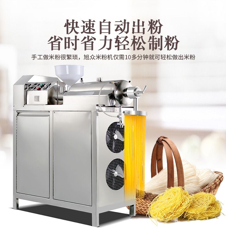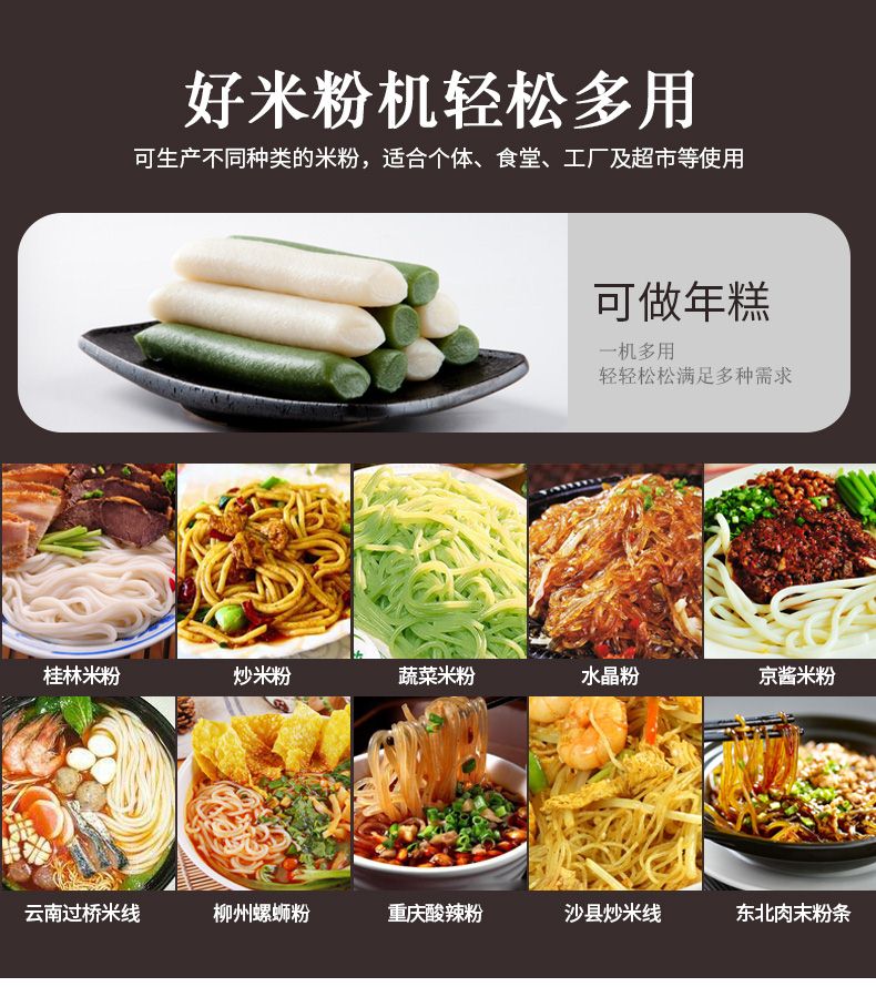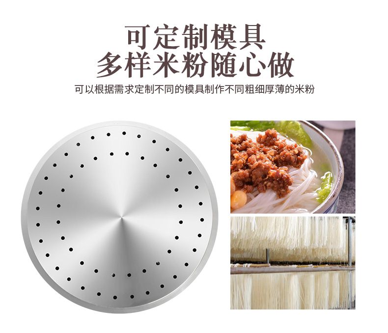 ◆ 米粉机生产多样性可生产米粉、米线、粉丝、粉条、年糕、玉米面条、各种杂粮粉丝、各种面条、杂粮面条、彩色面条以及以红薯、玉米、大豆、蚕豆等制成淀粉为原料的等多种食品而且每种食品厚薄、粗细等规格可根据需要任意调整。