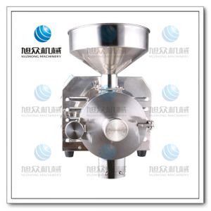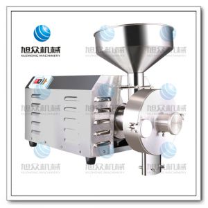 磨粉机的电机启动运转时,连接轴以及套在连接轴上的磨盘一起运转。待磨物料从料斗进入磨粉套,磨盘的绞龙和磨粉套之间的相对运转,破碎力使物料绞碎成小块颗粒,绞碎后的小颗粒在磨盘绞龙的螺旋运动下被带进两块磨片中间,磨片齿纹的相对运转,使物料在短时间内被粉碎成细小的粉状颗粒,粉从磨片的齿沟流出,甩向四周,同时被装在磨盘上的刮粉板带下,从出粉口流出来。