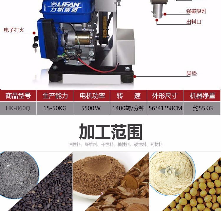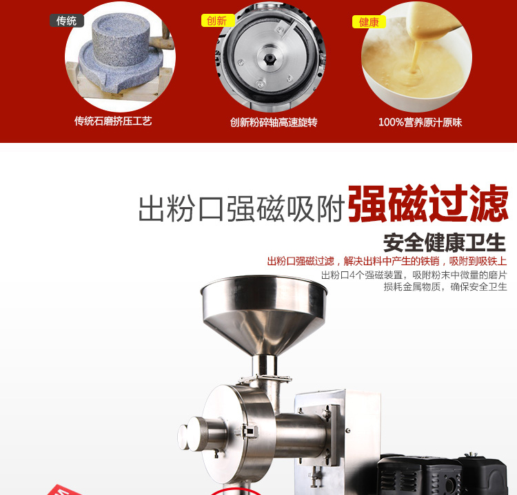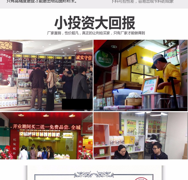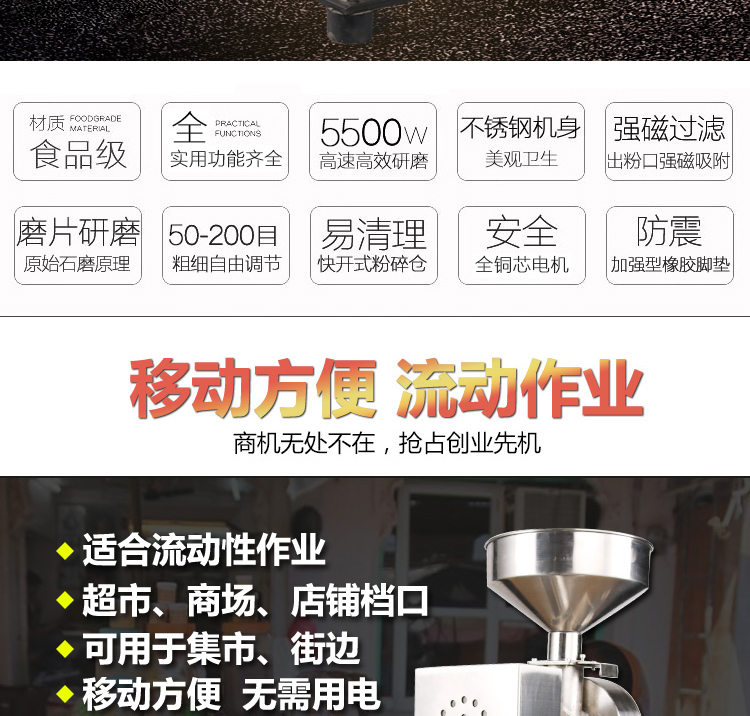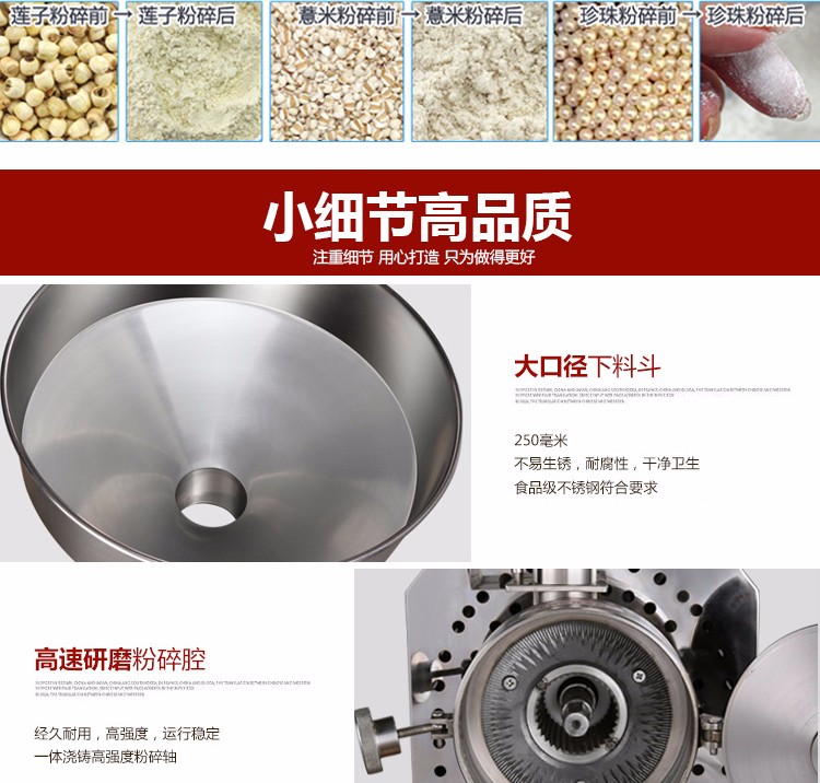 6、适用范围更广:适用于超市、商场、店铺档口现场加工各种五谷杂粮,和制药加工厂、医院诊所等加工中药材使用,特别适用流动作业。加工范围广: