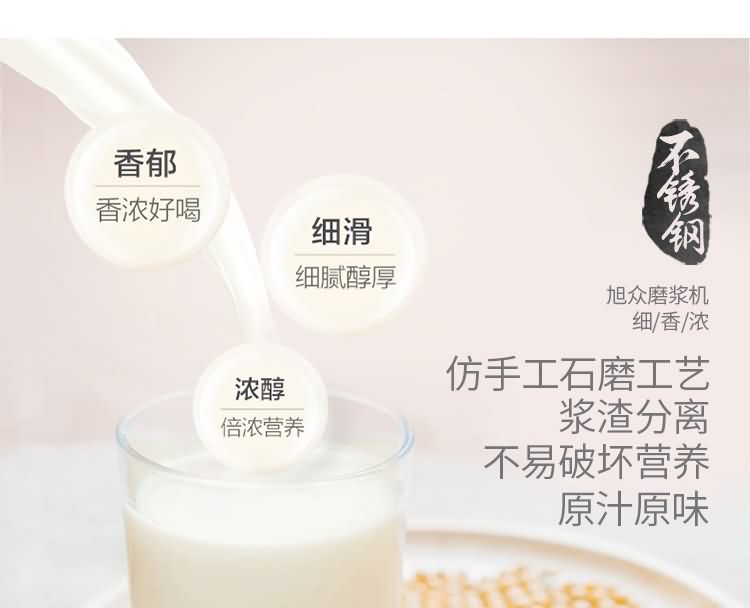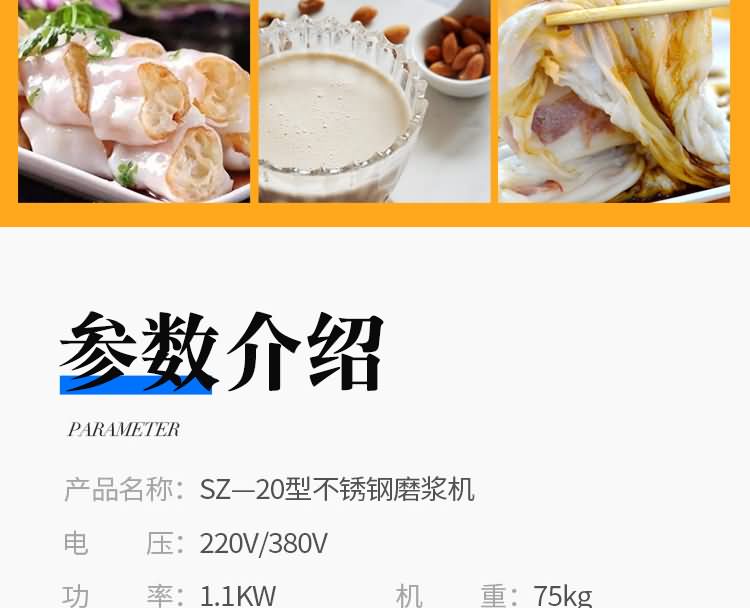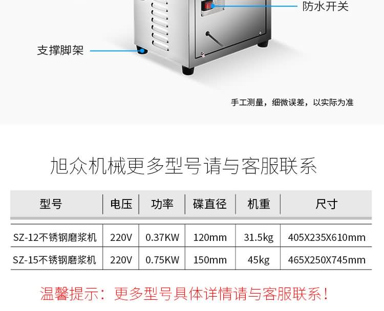 旭众牌SZ-12/15/20不锈钢磨浆机结构合理,造型美观,操作简便。具有体积小、重量轻、噪音低、省力,性能稳定、质量可靠、容易清洗、移动方便等优点,适用于豆制品厂、饮食服务业、食堂、饭店及个体商户使用。