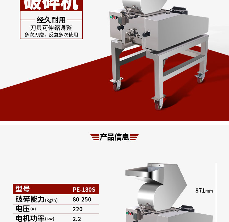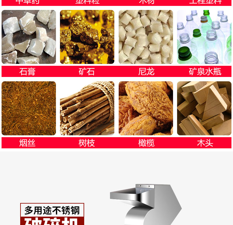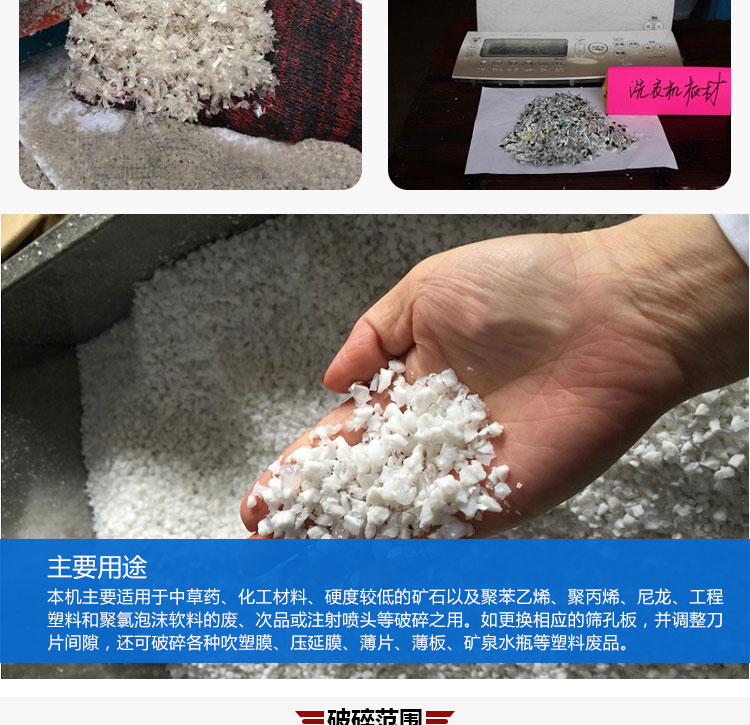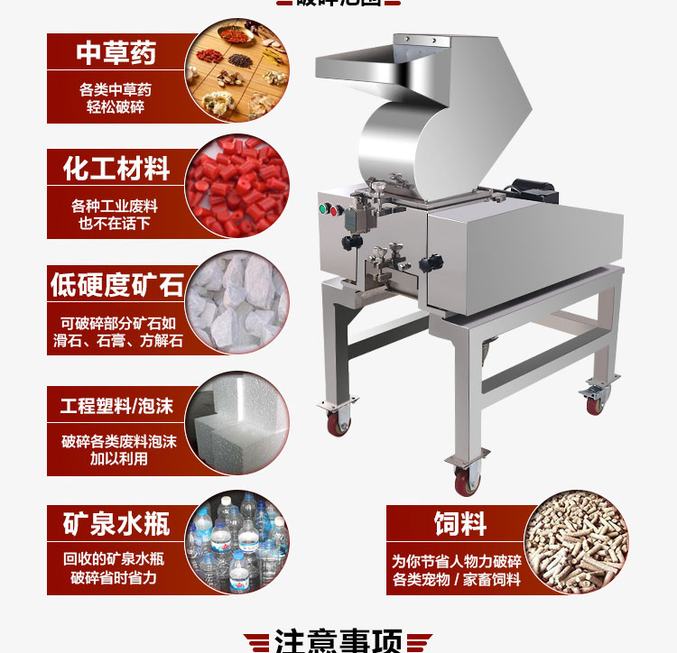 不锈钢破碎机适用于中草药、化工材料、硬度较低的矿石以及聚苯乙烯、聚丙烯、尼龙、工程塑料和聚氯泡沫软料的废、次品或注射喷头等破碎之用。如更换相应的筛孔板,并调整刀片间隙,还可破碎各种吹塑膜、压延膜、薄片、薄板、矿泉水瓶等塑料废品。