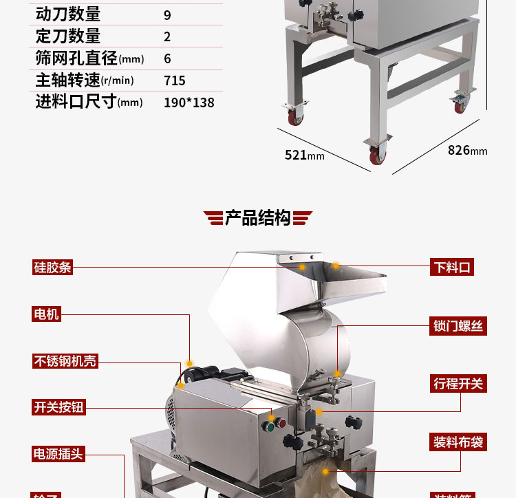 在食品、医药、化工、饲料、科研等行业的粉碎加工中,受原始物料形状各异,体积的大小不同及物质性态的影响,出现难进料,难加工的情况。根据这些特性,我们专门针对性的研发出全不锈钢破碎机。本机不受物料的粘度,硬度,软度等限制,对任何物料都能起到很好的破碎。