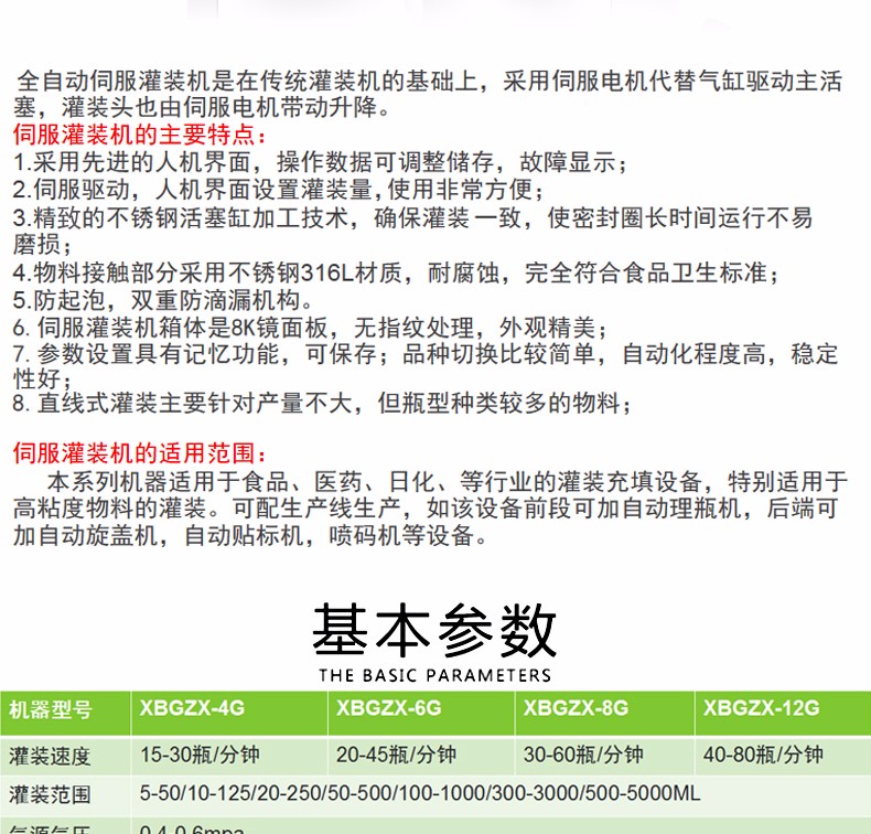8.直线式灌装主要针对产量不大,但瓶型种类较多的物料;伺服灌装机的适用范围: