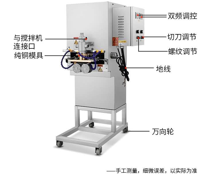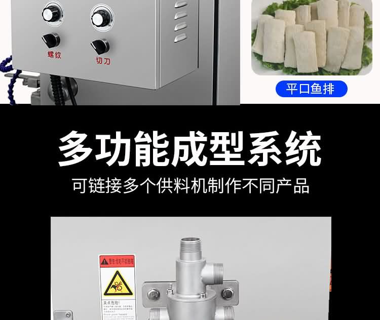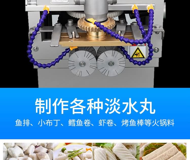 采用双电机双变频设计,不单只是速度可调,而且产品上的条纹旋度也可调,使得做出的产品更多样化,操作起来更方便。特别配备滚切刀,能生产出平口和圆口的淡水丸,具有一机多用的特点。