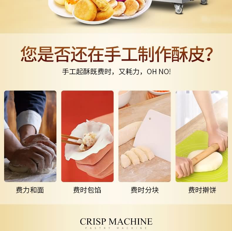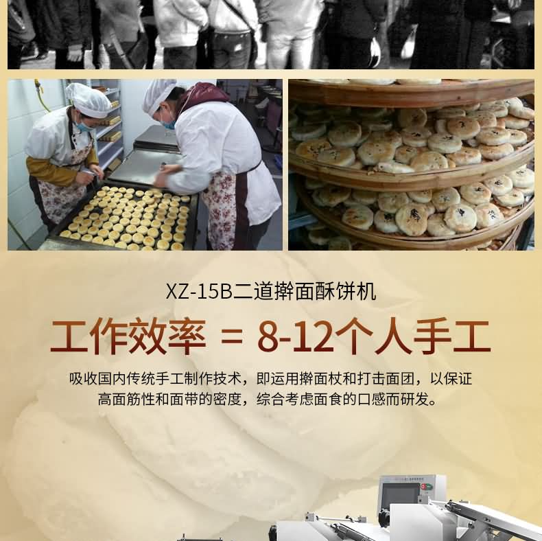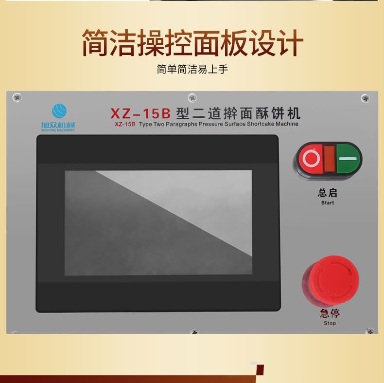 XZ-15B二道擀面酥饼机,生产速度快、效率高、生产流程流畅,各环节都辅以电控设备控制,不会出现堵面、破酥等现象。可生产苏式月饼、肉松饼、老婆饼、厦门馅饼、金华酥饼、拉丝面包等等特色酥饼,适用于大、中型糕饼生产厂家,免费提供工艺技术。