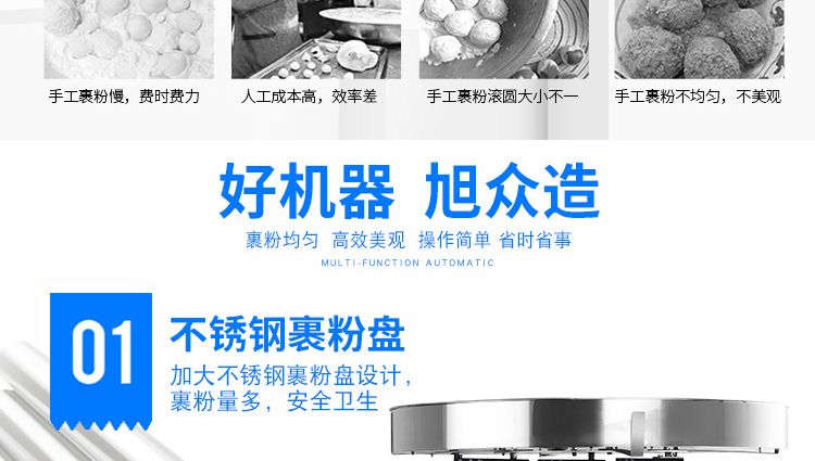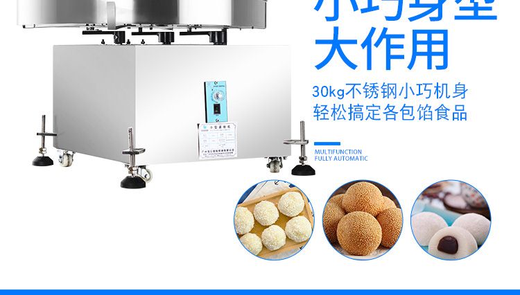 小型裹粉机用于裹芝麻、麻薯、糯米糍、干吃汤圆等熟糯米制品裹粉滚圆。