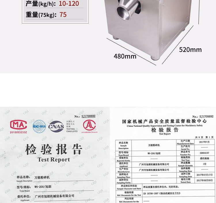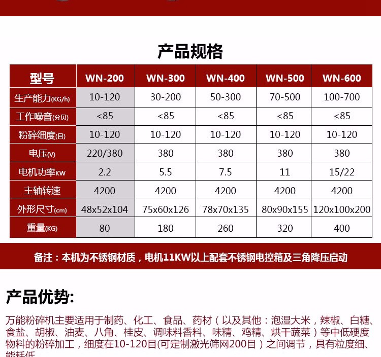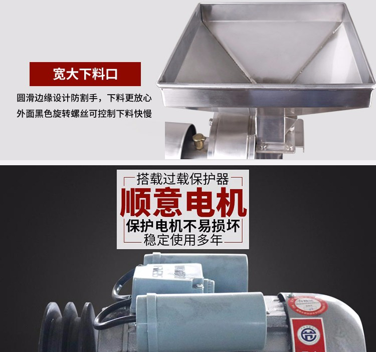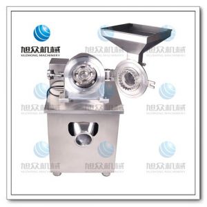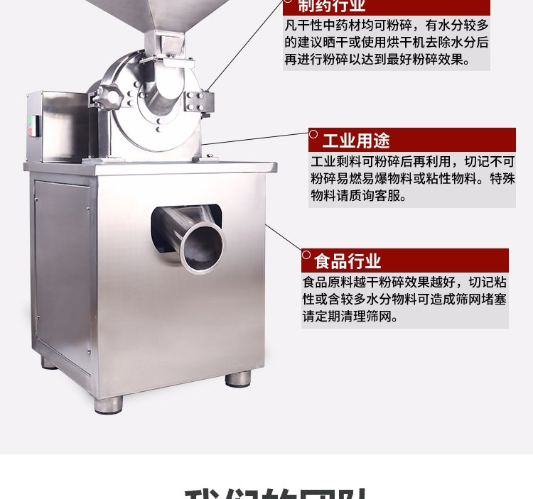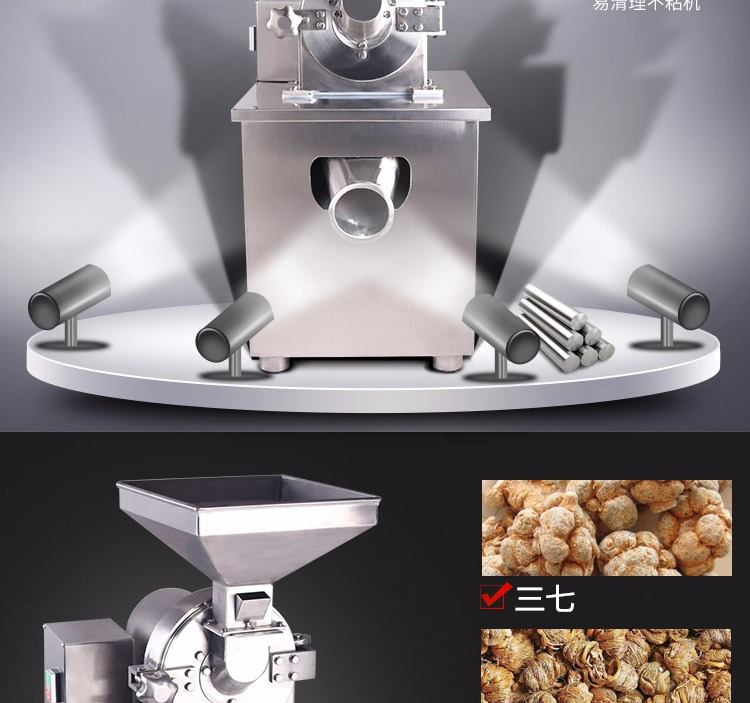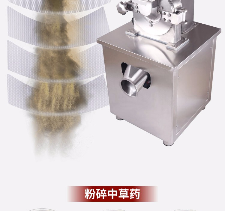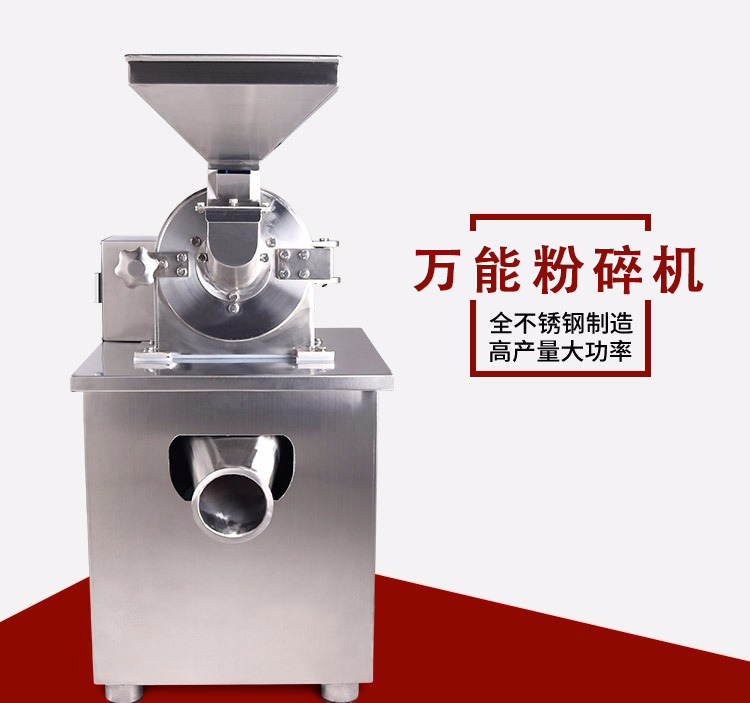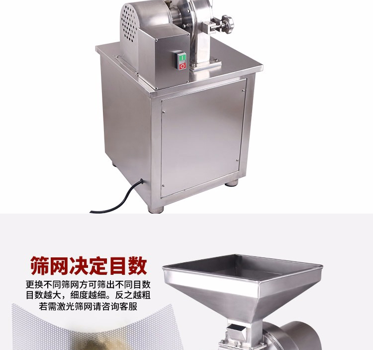 粉碎机系采用304号不锈钢制作,配套国标电机,主要用于化工材料、中药材含树根、树枝以及块状类物料、各种含油量不高的粮食、五谷杂粮以及其他一些硬性、脆性的物料。本机利用活动齿盘和固定齿盘间的相对高速运转,使被粉碎物经齿盘冲击、摩擦及物料彼此间碰撞而获得粉碎。粉碎物可直接从磨腔中排出,经出料口出来,一般的物料经过粉碎后要经过棉布袋来收集,粉碎后的物料收集在袋内,空气则从布袋的细小孔眼出来,不会将细粉排出,从而起到不浪费,不污染的效果。粒度大小由更换不同目数的筛网决定。本机结构简洁、坚固,运转平稳,粉碎物料快速、均匀,效果良好。本机全为不锈钢材料制作,机壳内部(粉碎槽)所有齿槽经精密机加工从而达到表面平滑,易于清理,改变了普通粉碎机内壁粗糙、易积粉、难清理的现象,使食品、药品、化工等生产更能符合标准,达到GMP的卫生要求。