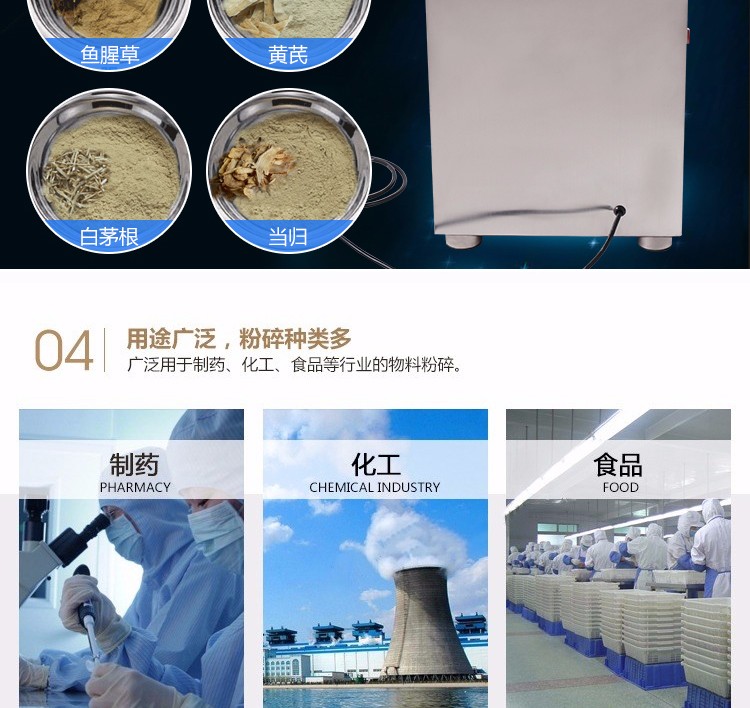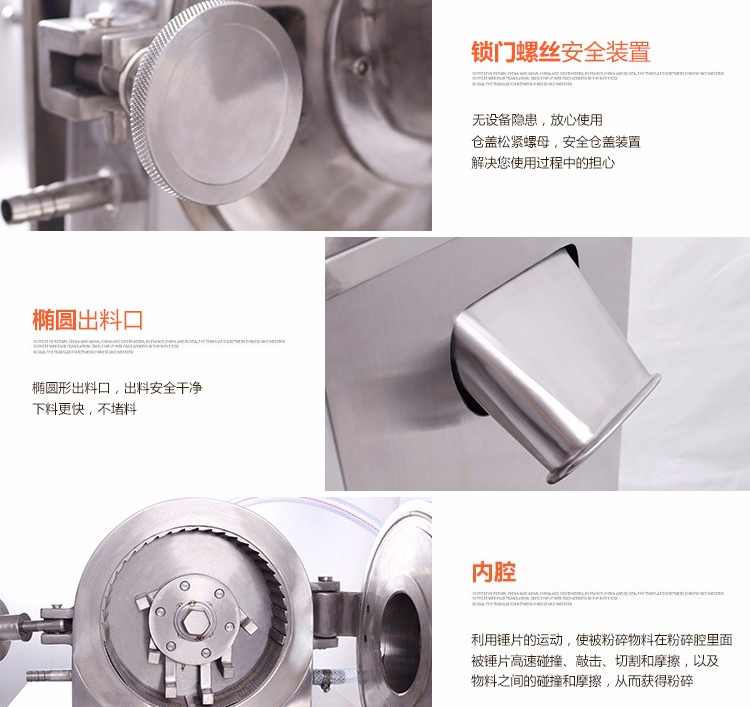 万能粉碎机主要适用于制药、化工、食品等行业的物料粉碎。禁用于粉碎易燃易爆品。禁止用于金属物品的粉碎。不适用于大块物料的粉碎。不适用于粉碎含水量太高、含油量太高的物料,因为粉碎后出水或者出油,形成酱状物,会堵塞筛网,影响出料,造成出料不畅,甚至卡死、闷机现象。本机不适用粉碎所有粘性物料,也不适合发热后变软和变粘的物料。