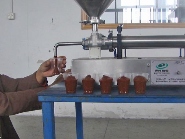 定量灌装豆瓣酱选半自动酱类灌装机,专业灌装带颗粒酱类食品,辣椒酱灌装机效果如图所示: