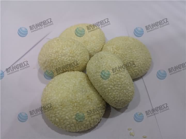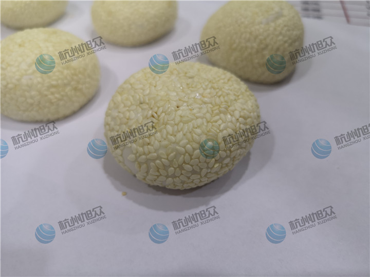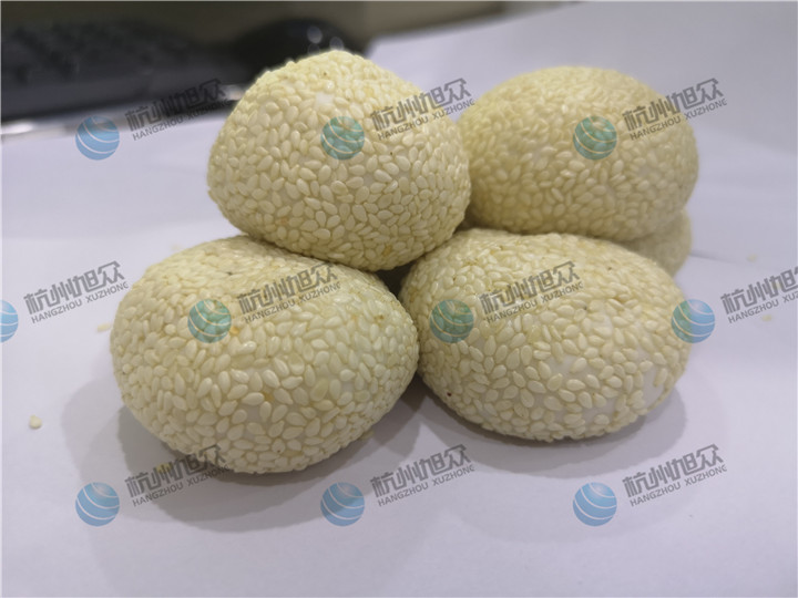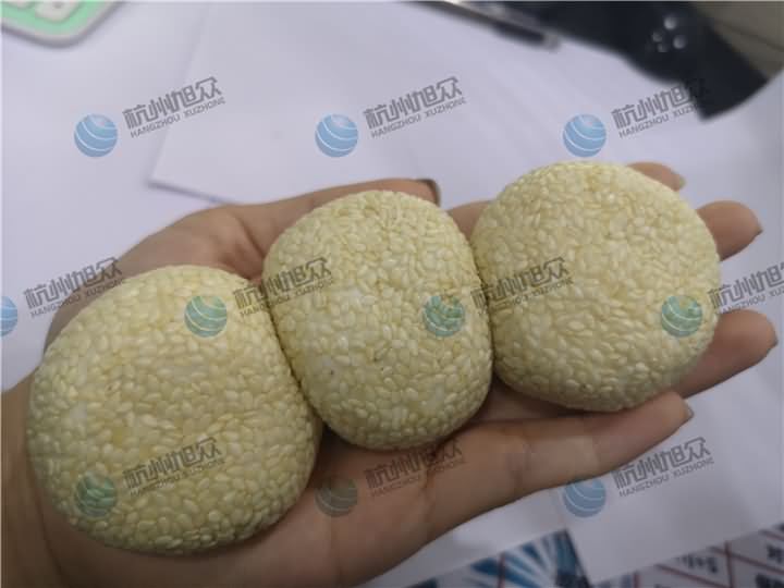 包馅机做出来的麻球就是这么一个光溜溜的麻球,克重大概48g左右,皮在46g,芝麻馅占非常小的比例,然后客户还要裹白芝麻外衣,不可裹粉机目前没有样机,试不了于是采用了人工去给它们裹上白芝麻的效果如下图: