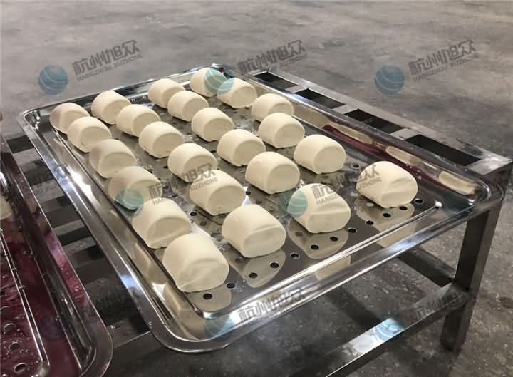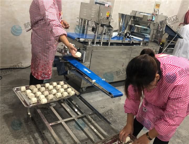 食品厂专用包子馒头机做包子、馒头,多功能包馅机做青团,两台机器搭配使用,产量是跟上了,不过好像还是需要人员帮忙去摆盘等等后续工作,那么我们来看看它们齐聚一堂是如何分工合作的状态: