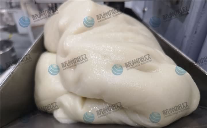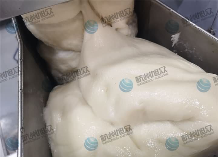 馅料的话也是客户自己拌好带过来的,这是最开始的黑芝麻白糖馅,就像一堆散沙一样没有一点流动性,这样的馅料没办法通过机器包馅的,因为客户也是需要用机器代替人工来包馅成型,于是愿意稍微改变点工艺