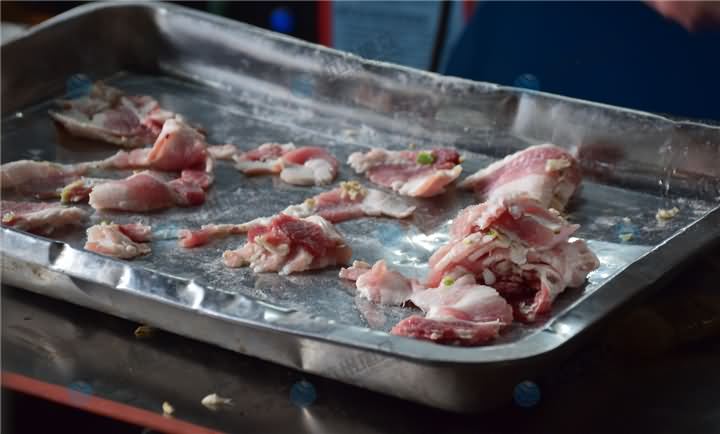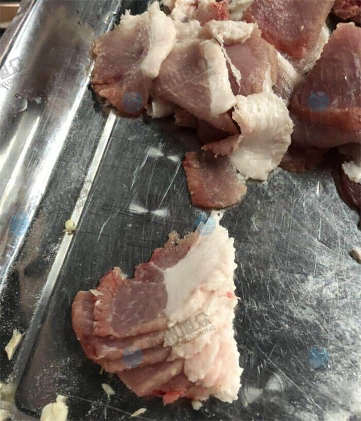 斜切鱼片机切五花肉片如何呢?一般斜切鱼片机切鱼片效果更好,当然也是可以斜切不带骨的肉片,不过切出来后的整体没有鱼片看起来规整,不过肉片也是片片分明的,因为客户想要买切鱼片机切鱼片,但是又想在同一台机器上切肉片,担心斜切鱼片机切肉片效果差,于是给他安排上了XZ-280切鱼片机切五花肉片:
