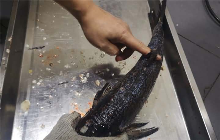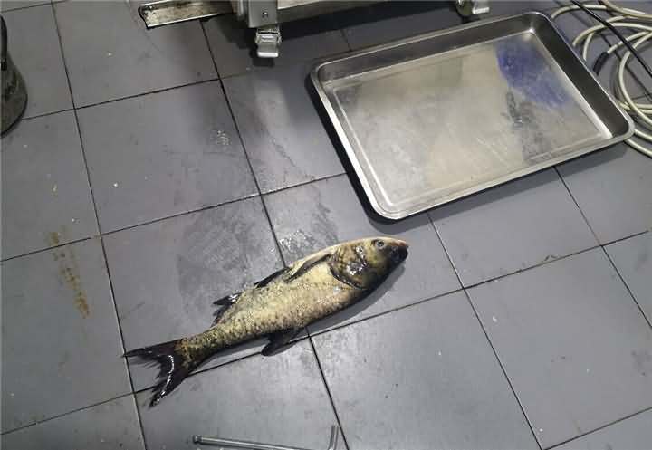 客户带着白鲢来到了旭众机械(杭州市滨江区楚天路299号),本来只是想考察XZ-018开肚去鳞杀鱼机杀白鲢的效果如下图: