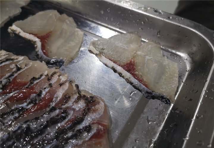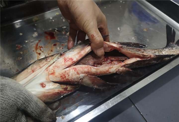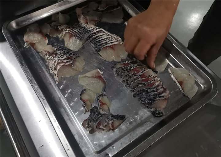 鱼鳞去的是很干净,但是鱼鳃盖上的鱼皮有些破损,因为客户做的也不会剁椒鱼头类的,所以对于这些小破损也不介意,试完后发现有鱼片机,便想着白鲢反正都已经杀好了,用切鱼片机片鱼片看看效果,于是也给安排上了切鱼片机: