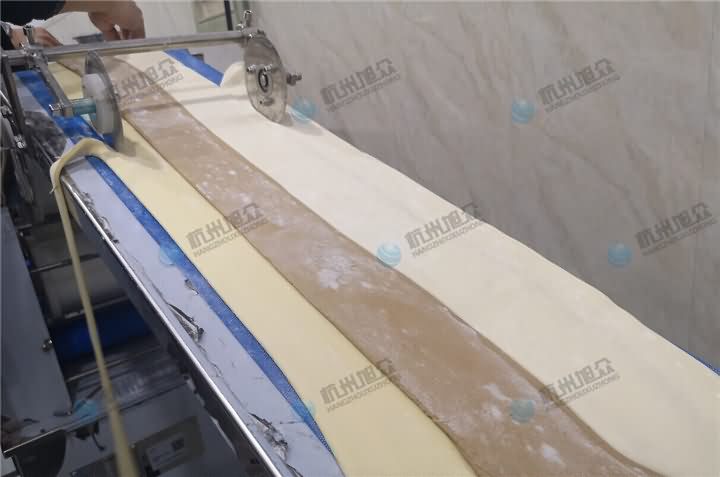 2、面团再用压面机压成面皮后,按顺序摆放好