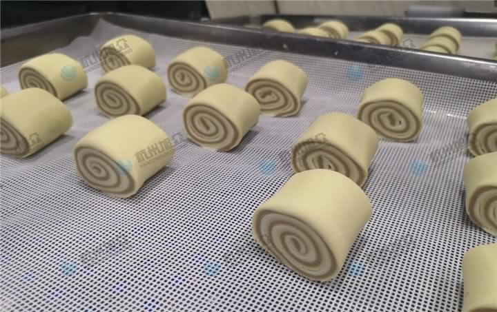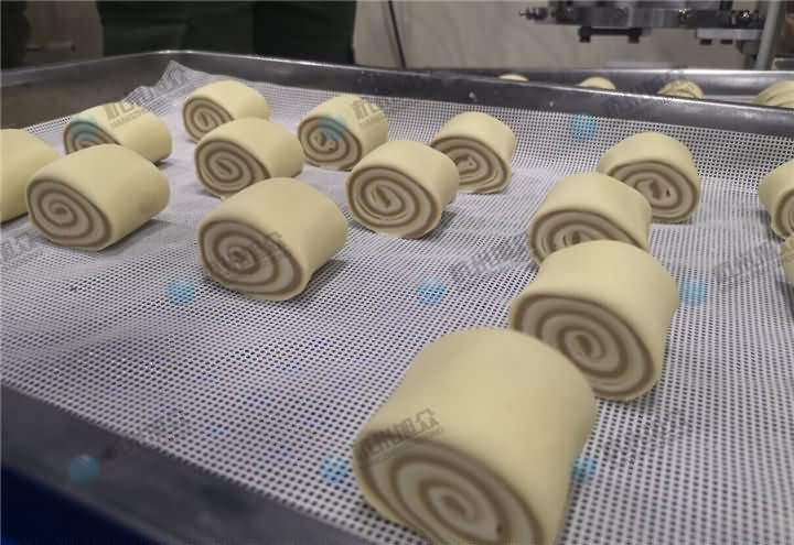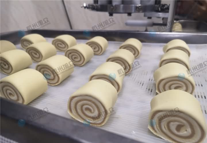3、将摆放好的面皮放置XZ-290AS卷面式包子机输送架上,开启开关,自动整形压面卷面切割成方馒头