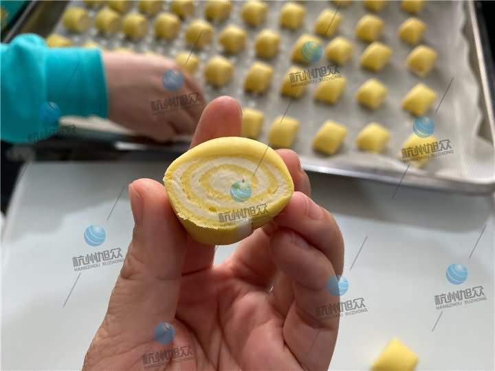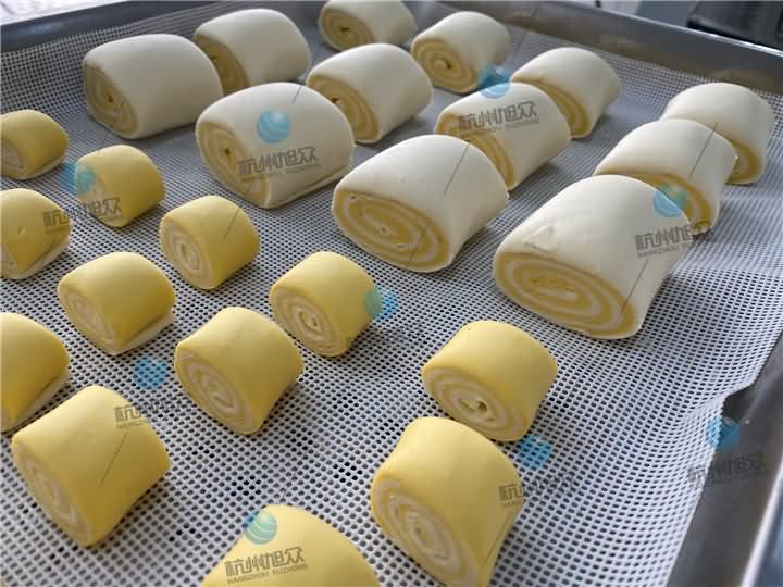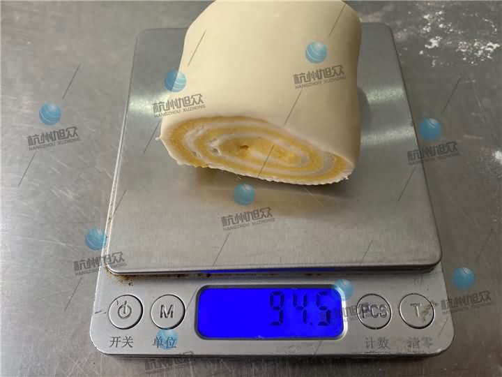 3、再通过MP800A刀切馒头机压面、卷面、刀切成一个个双色杂粮方馒头