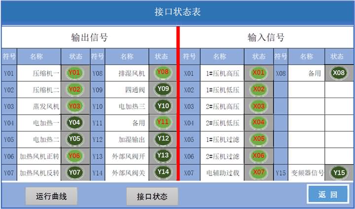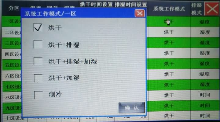 可以非常直观的看到,烘房的温度、湿度、运行时间、压缩机是否在工作、各种风机的工作状态等。底部还有多个二级菜单按扭。点击进入还进行更多的设置及状态查询。