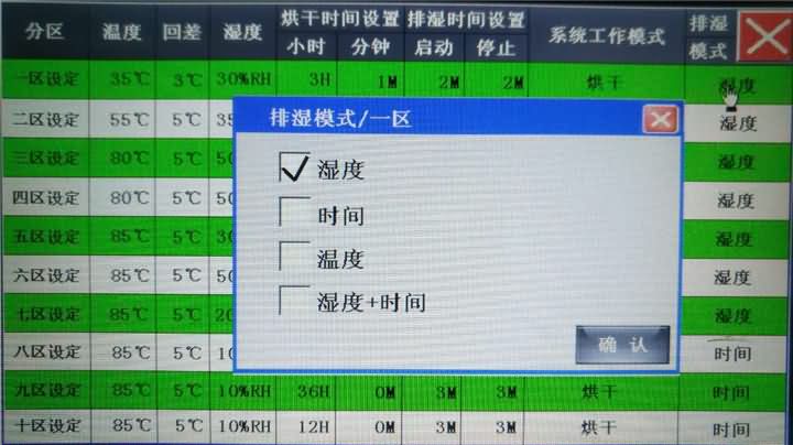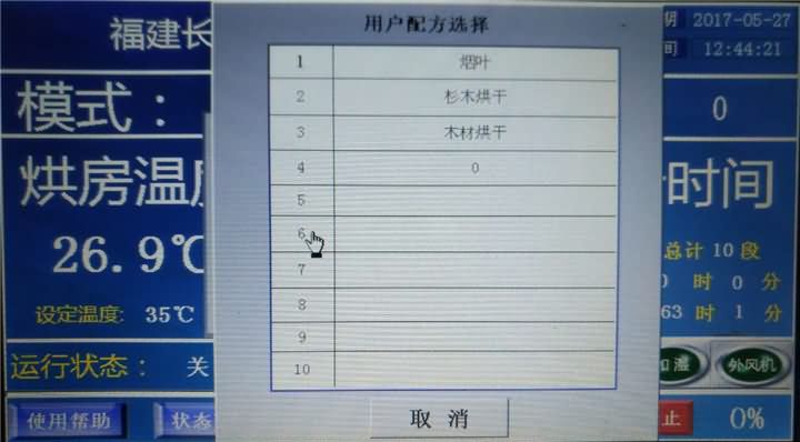 烘房一共可以分十个阶段进行烘烤,每个区间可以单独的设置温度、湿度、烘烤时间、工作模式以及排湿方式。设置完成后点击右上角×会提示是否保存。点【取消】不保,点【确定】进行保存并输入名称,以后从【用户配方选择】进入可以直接调用。