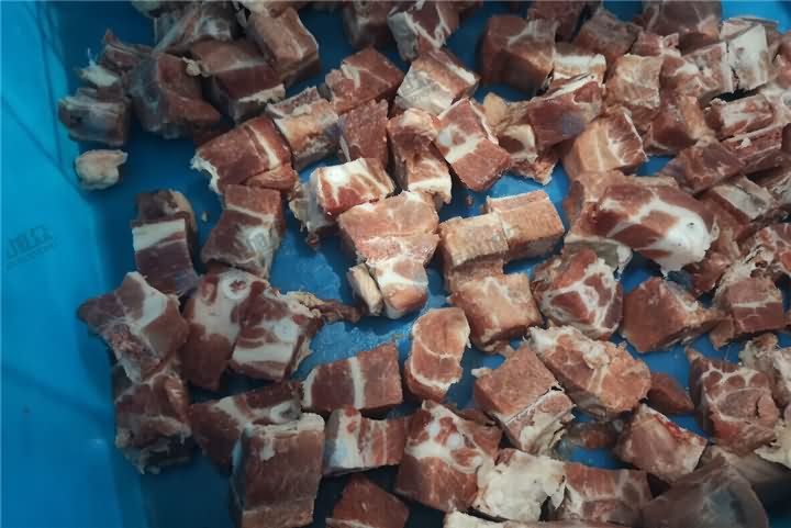 旭众新款XZW-300鱼禽肉类剁块机可剁微冻过的肉类、禽类、小肋排等。大排、猪蹄、筒骨不建议用剁块机哦!那么先看看鱼禽肉类剁块机剁肋排块效果: