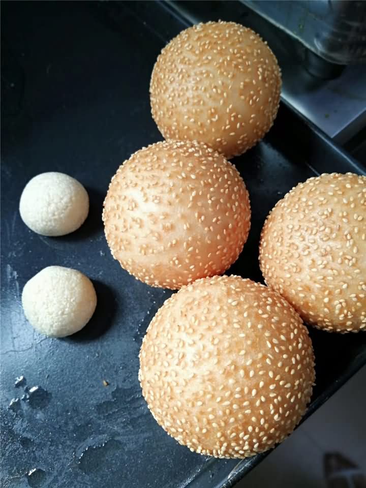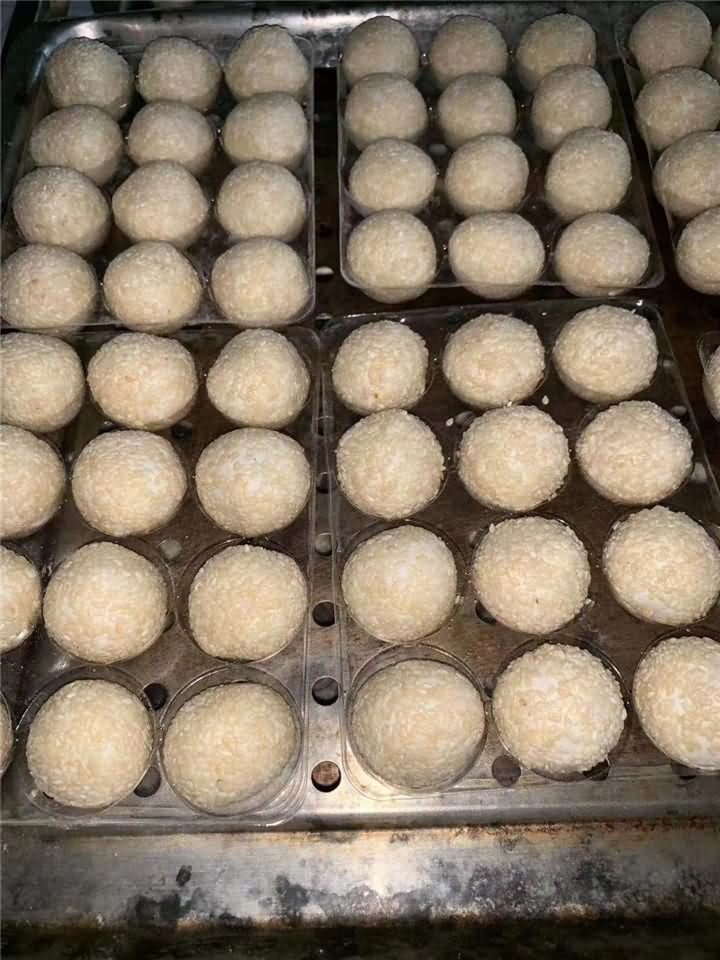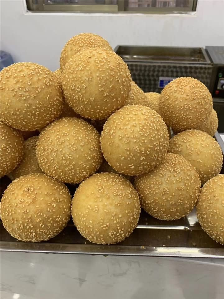 刚刚炸出来的麻圆成色非常好!麻圆没炸之前都是用全自动汤圆机自动包馅成型,至于后期炸出来的麻圆效果,那就是属于个人技术问题,如果没有技术的话可以考虑购买汤圆机,我们将面粉提供做麻圆的工艺配方教学哦!