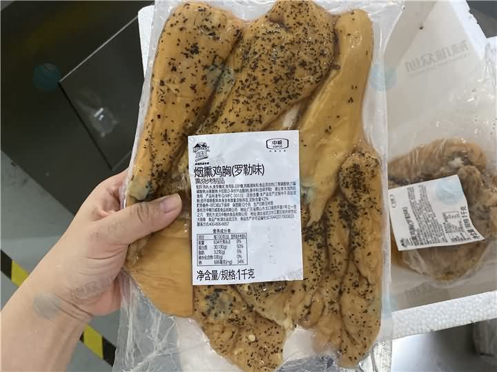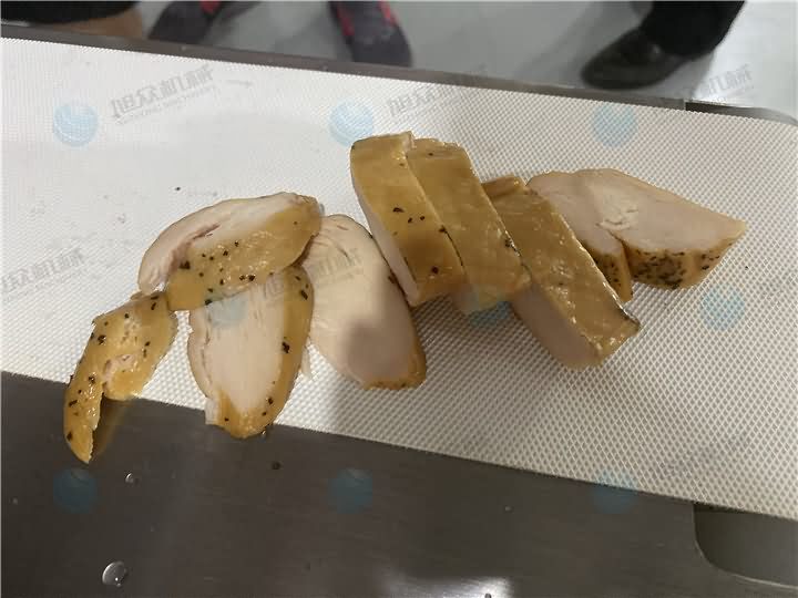 烟熏鸡胸切片优选熟肉切片机,鸡胸加工厂老板网上找到旭众熟肉切片机,听说机器可以现场演示,带了好几包烟熏鸡肉来到现场,熟肉切片机切鸡胸肉从10mm→6mm→3mm→2mm不断演变,最终调到客户满意的2mm的薄度,当场签定合同直接定购熟肉切片机,那么我们来看看熟肉切片机切鸡胸肉片的效果: