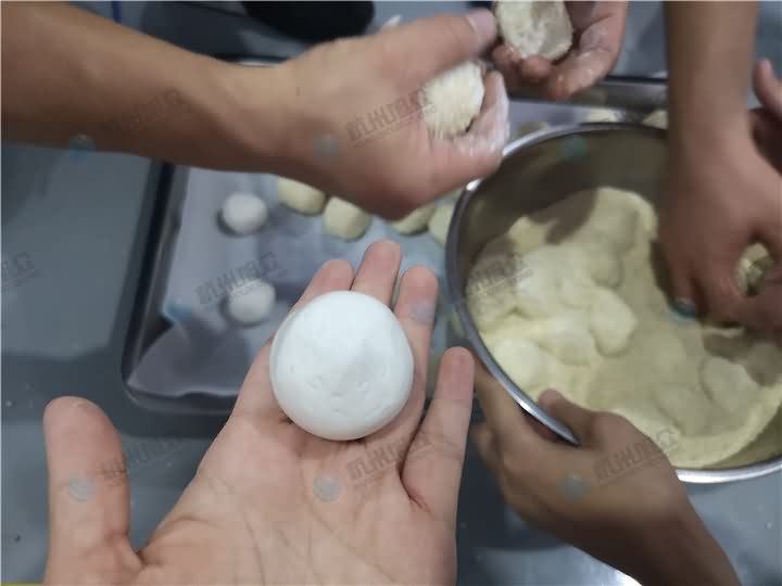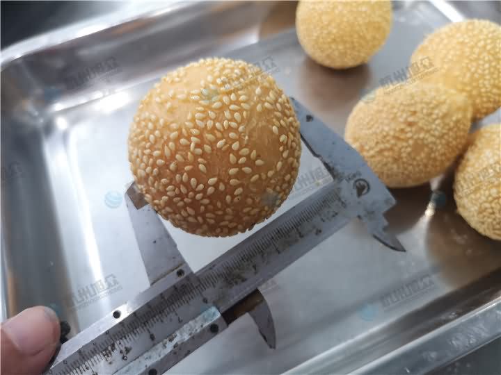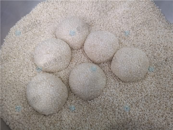多功能包馅机做麻球咯!就是一开始做出来的团子形状,如要裹芝麻则需要人工手工裹,或者可以配一台自动裹粉机器,专门裹粉、裹芝麻、红米、紫米等等,先来看看包馅机做的麻球效果: