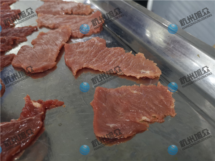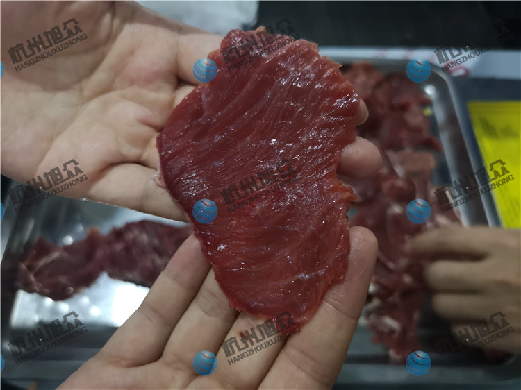 牛肉加工厂的福利,全自动斜切牛肉片/鱼片机适用于肉类加工厂,鱼类加工厂,大型餐饮行业等单位。全自动斜切鱼片机切2.5mm鲜牛肉片效果如图:
