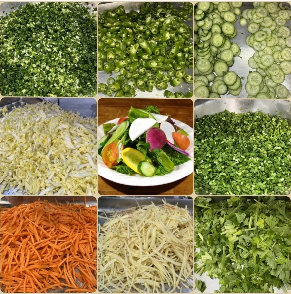投料快,不伤手,可轻松应对叶菜类和根茎类蔬菜的切割需求,包括切段、切条、切碎、切圆片、切半月片、切丁、切丝等多种切割方式。