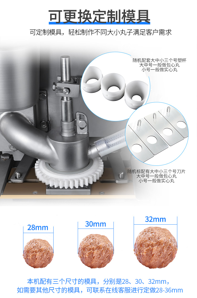 肉丸成型机为包馅肉制品成丸设备,能生产出各种大小尺寸的包馅鱼丸、撒尿牛丸、猪肉丸、牛肉丸、及包馅贡丸等,并可做不包馅的各类丸子。该设备具有速度快、卫生方便、易拆洗等特点,可代替几十个人手工生产,可为厂家节省人员的投入、提高生产速度。