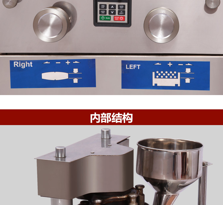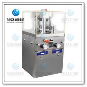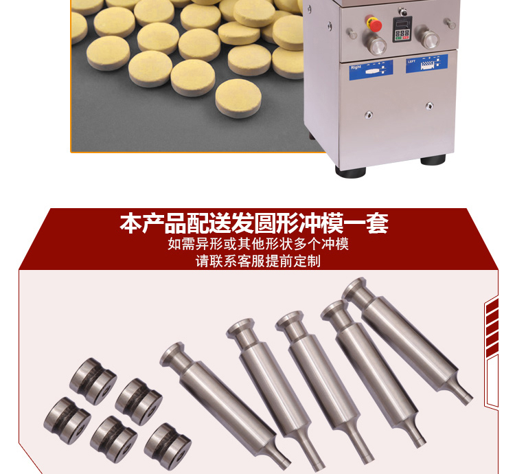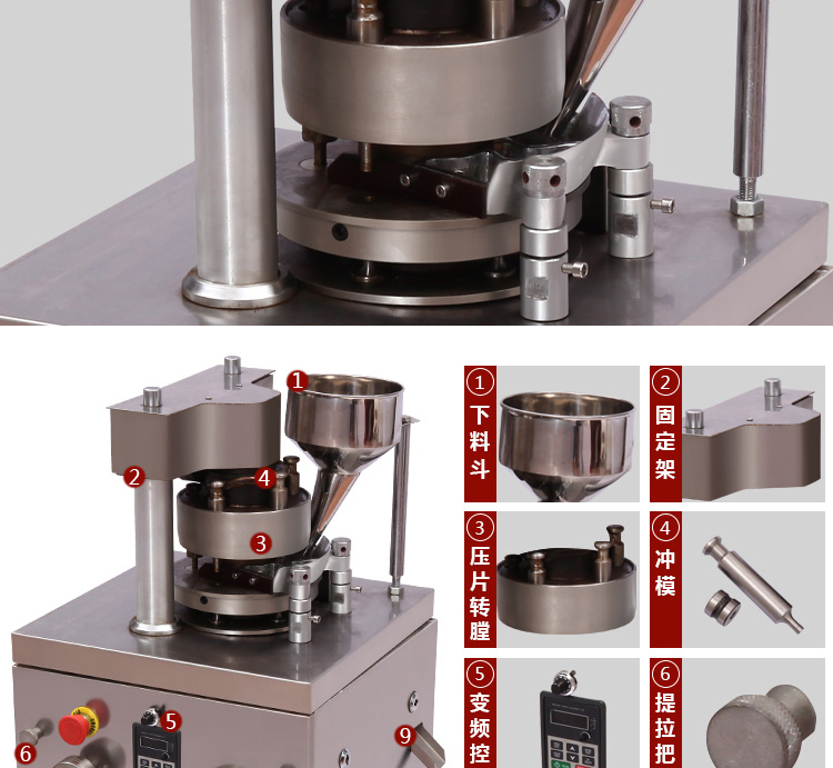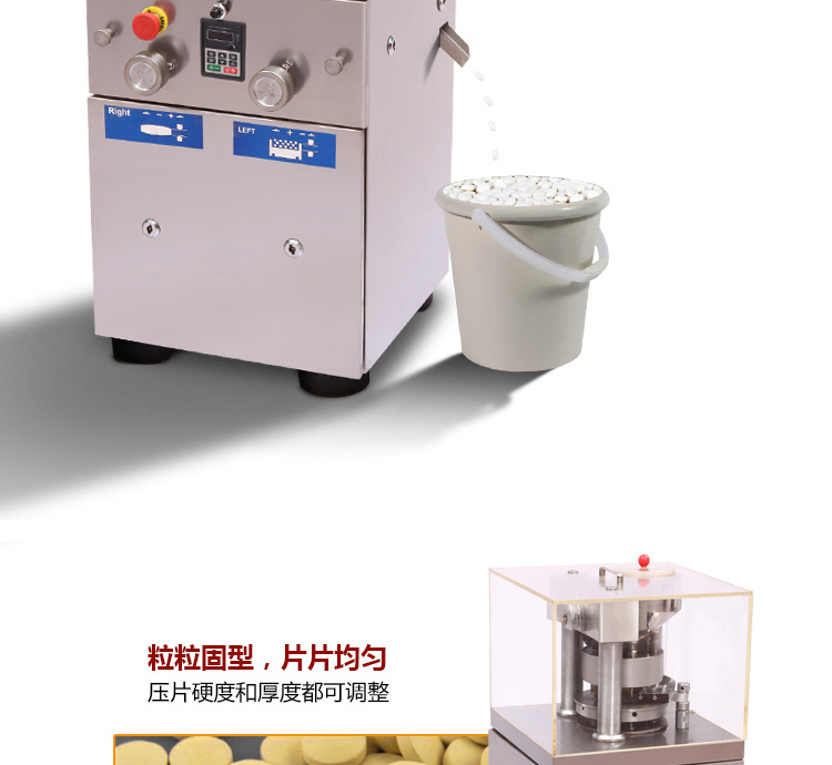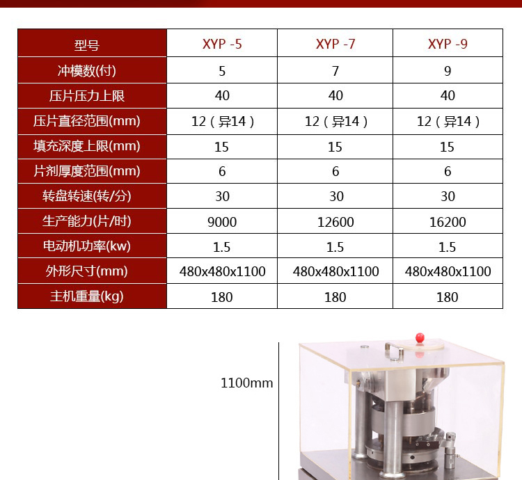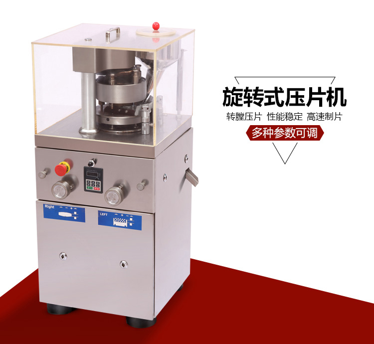 小型旋转式压片机有XYP-5、XYP-7、XYP-9三种规格,分别有5、7、9副冲模,是目前重量轻、体积小的旋转式压片机。整机为不锈钢材料精密机加工制作而成,支撑架为铝合金材料,上、下可以独立拆开,便于运输。工作室由全透明有机玻璃罩密封,可有效防蚊虫、防尘,清洁、美观,工作情况一目了然,废料容易清洁。清除残余药粉和废料时可以将玻璃罩移开,非常方便。