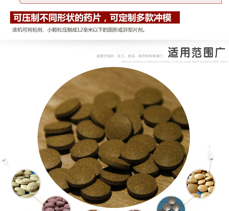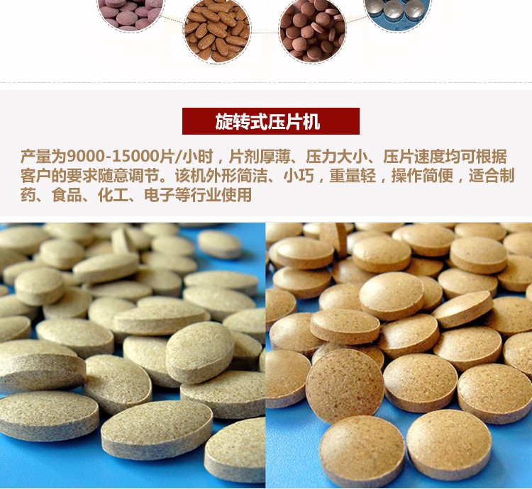 旋转式压片机可将粉剂、小颗粒压制成12毫米以下的圆形或异型片剂,产量为9000-15000片/小时,片剂厚薄、压力大小、压片速度均可根据客户的要求随意调节。该机外形简洁、小巧,重量轻,操作简便,适合制药、食品、化工、电子等行业使用。配有过载保护装置,当压力过载时,能自动停机。本机配有电磁制动电动机和其它安全保护装置,运行时也能调整与操作。