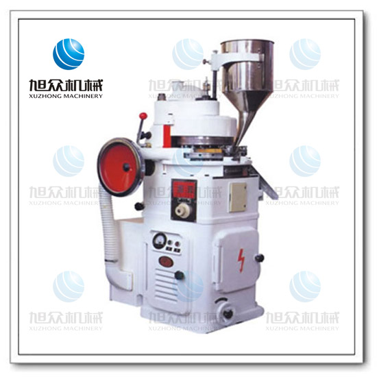 本机用以将各种颗粒状原料压制成圆形片剂,最适合于小批量生产。其特点是转盘上可装15-19付冲模,旋转一周即可压制15-19片。转盘速度、物料的充填深度、压片厚度均可调节。机上的机械缓冲装置可避免过载而引起的机件损坏。机体一侧配有吸粉箱,通过吸咀可吸取机器运转时产生的粉尘,避免粘结堵塞。