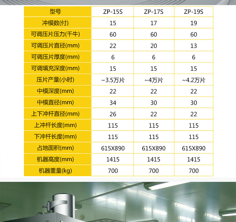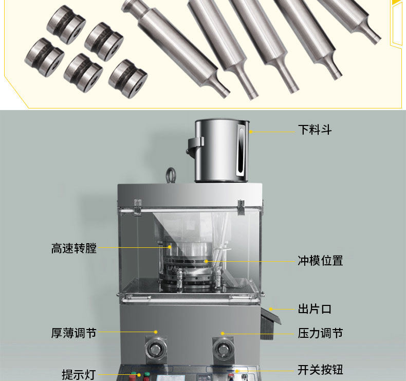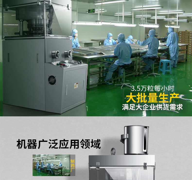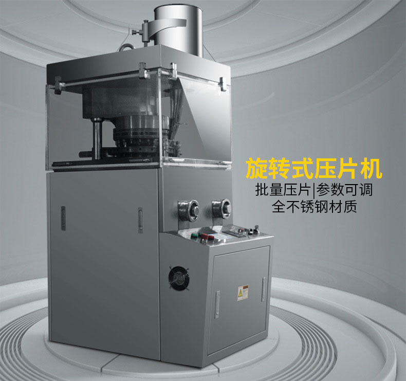 ZP-15S/17S/19S不锈钢旋转式压片机是一种自动旋转连续压片的机器。它主要用于制药、化工、陶瓷、食品、电子、塑料及粉末冶金等工业。本机适用于把各种颗粒状原料压制成片剂,而不适用于半固体、潮湿粉子和无颗粒特细粉末压制。