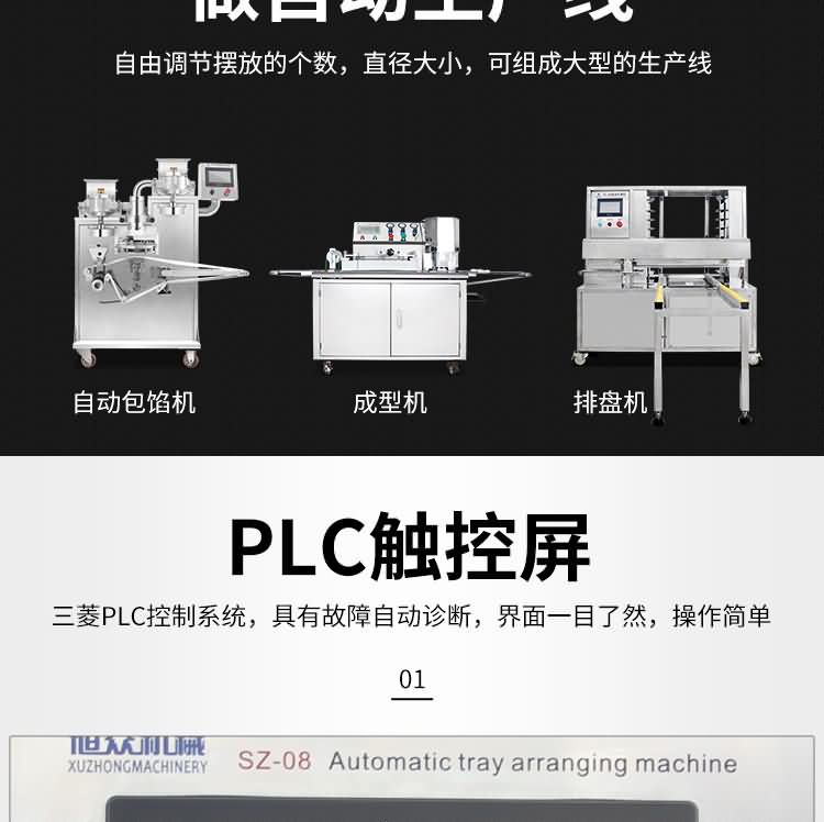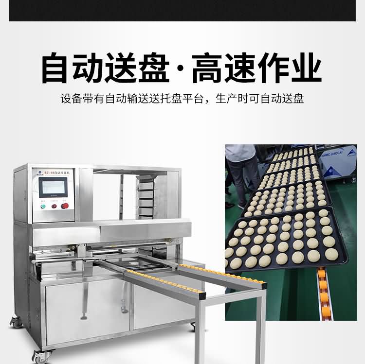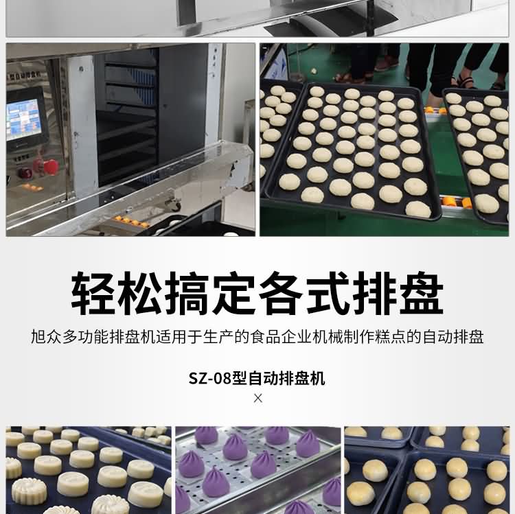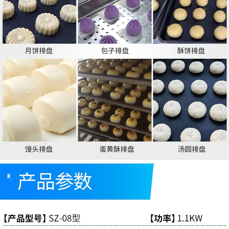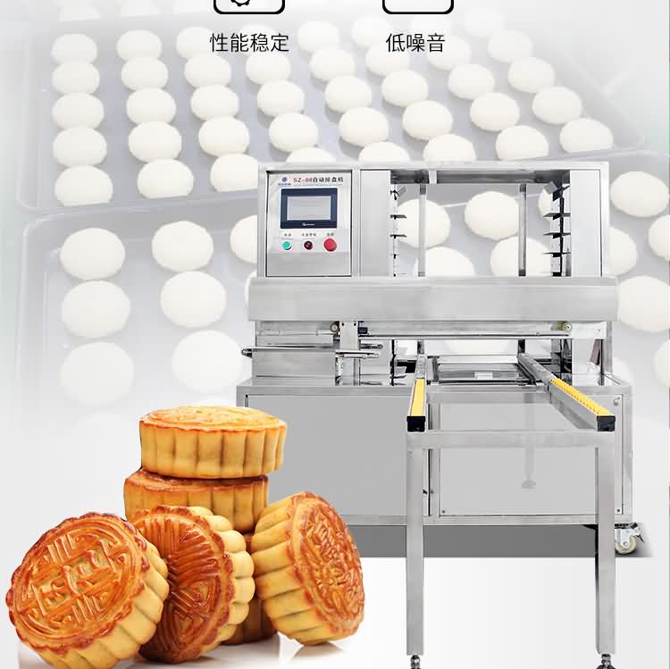 SZ-08型月饼自动排盘机,可同于制作各种月饼。适用于蛋糕房、休闲食品厂、食品加工产、面包房、月饼加工厂、超市、学校、食堂等各种工作场所。可满足不同客户群体。免费提供工艺技术。