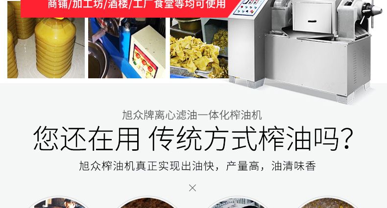 重要提示:离心滤油机建议配XZ-LL100(离心滤油机需要加盐水滤油,该机通过高速旋转产生离心力,使比重不同的液体与固体自动分离,从而达到油渣分离。),正压滤油机建议配XZ-ZL2(正压滤油是与空气压缩机组合,如果给客户配正压滤油机需要买个空压机。正压滤油油桶内的毛油处于密闭状态时,压缩空气送入桶内形成一定压力,使其强行通过滤布。)榨油机如有榨较硬的物料如山茶籽一定要用518以上而且是-2的设备(客户榨山茶籽和硬物料推荐用-2设备,如果榨花生菜籽等高油较软的物料请推荐-4设备)。