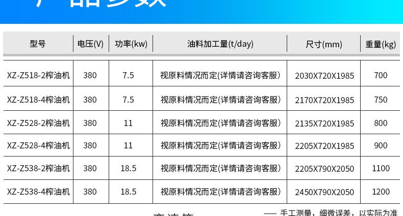 备注 | 每小时产量550斤物料(根据物料不一样产量也不一样),辅助设备配离心滤油机或正压双桶滤油机(需选配空压机)、炒货机配XZ-C250或XZ-CD300 |