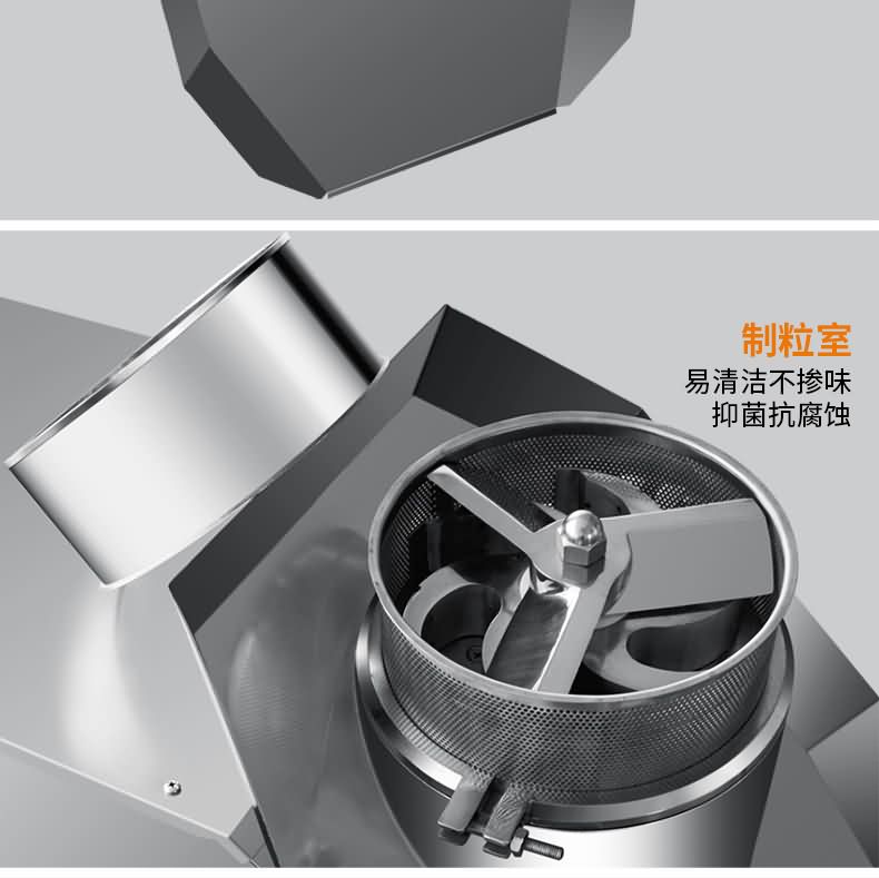 摇摆式颗粒机制得的颗粒一般粒径分布均匀,有利于湿粒均匀干燥。它的主要特点为旋转为旋转滚筒的转速可以调节,筛网装卸容易,还可适当调节其松紧。机械传动系统全部密封在机体内,并附有调节系统,提高了机件的寿命。但由于成粒过程是由滚筒直接压迫筛网而成粒的,物料对筛网的挤压力的摩擦力均较大。使用金属筛网时易产生金属污染处方,而尼龙筛网由于容易破损需经常更换,在使用时应加以注意。